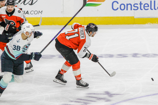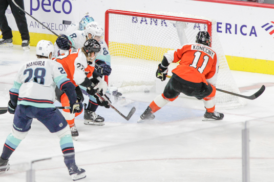 Travis Konecny #11 of the Philadelphia Flyers scores his first goal of the season during the second period against the Seattle Kraken