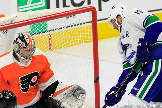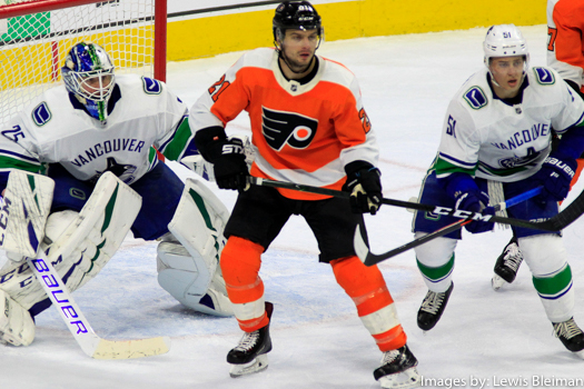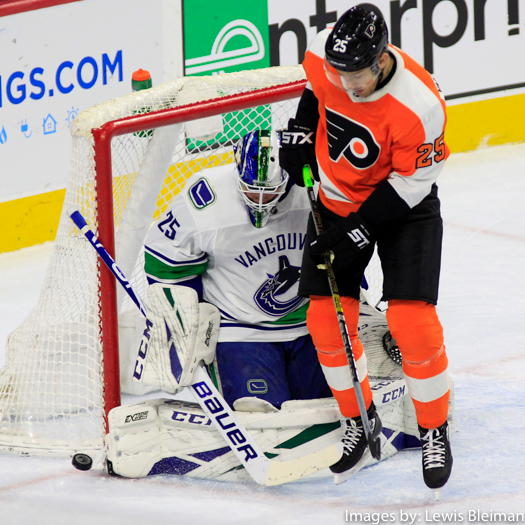 Goalie Jacob Markstrom (#25) of the Vancouver Canucks looks around Center Scott Laughton (#21) of the Philadelphia Flyers