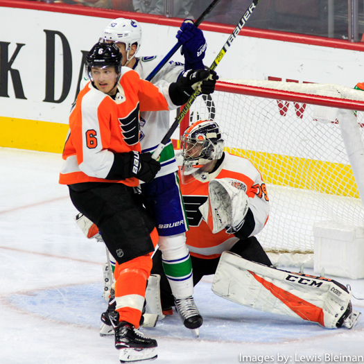 Philadelphia Flyers Defenseman Travis Sanheim (#6), Center Bo Horvat (#53) of the Vancouver Canucks, and Goalie Carter Hart (#79) of the Philadelphia Flyers