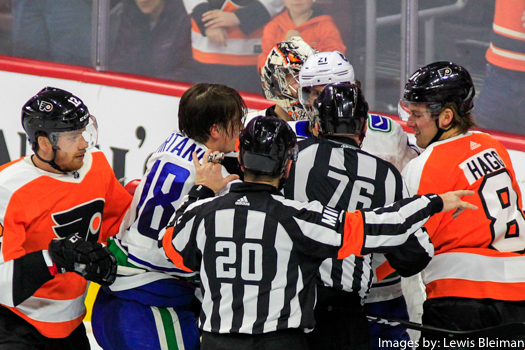 Right Wing Jake Virtanen (#18) of the Vancouver Canucks and Defenseman Robert Hagg (#8) of the Philadelphia Flyers square of in the third period