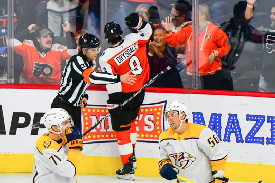 Referee Alex Lepkowski (#44) signals goal as goalscorer Jamie Drysdale #9 of the Philadelphia Flyers celebrates with fans.