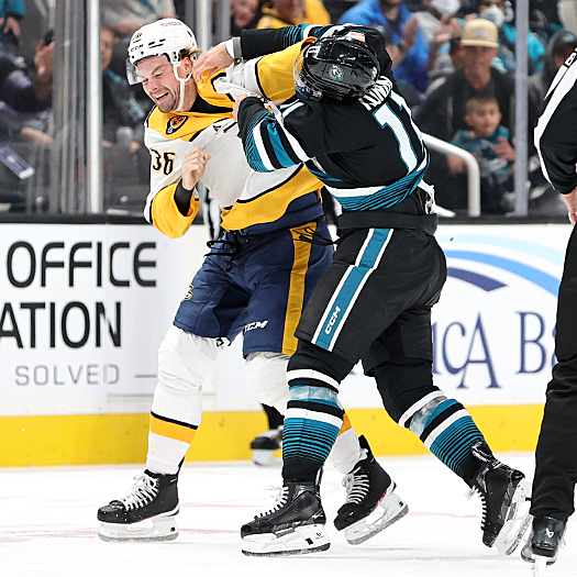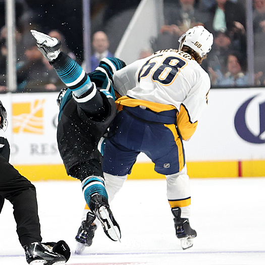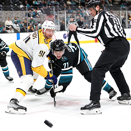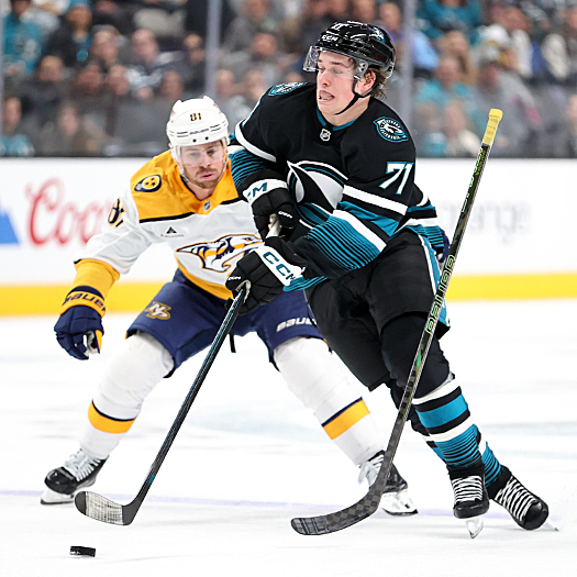 Predators Jonathan Marchessault (81) loses his stick as he defends against Macklin Celebrini (71) – Photo by Jack Lima