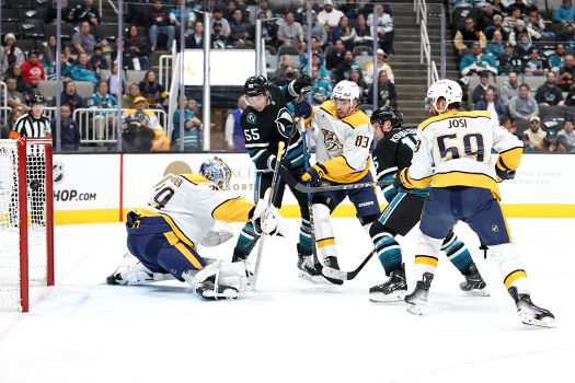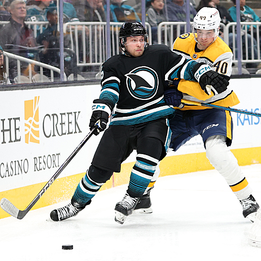 Sharks forward Nikolai Kovalenko (15) attempts to hold off Predators Fedor Svechkov (40) as he moves around the net – Photo by Jack Lima