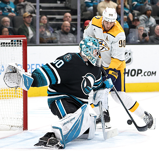 Sharks goalie Yaroslav Askarov reaches back to stop a shot attempt by Ryan O’Reilly (90) – Photo by Jack Lima