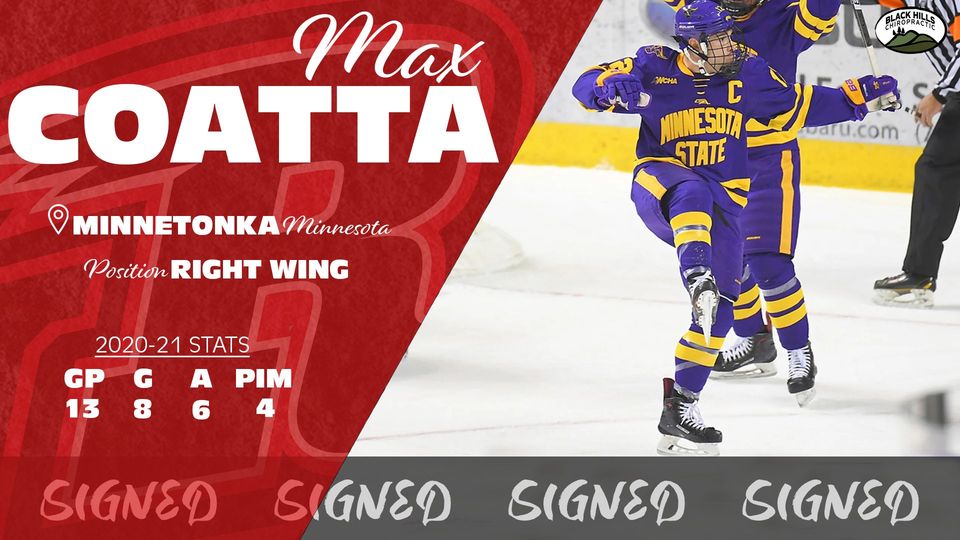 RAPID CITY, SD –The Rapid City Rush, proud ECHL affiliate of the NHL’s Arizona Coyotes, announced today via a Black Hills Chiropractic Roster Adjustment that forward Max Coatta has been signed for the 2021-22 season.