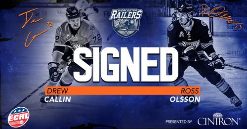 WORCESTER, MA – The Worcester Railers Hockey Club (@RailersHC), proud ECHL (@ECHL) affiliate of the New York Islanders (@NYIslanders), and Railers HC General Manager and Head Coach David Cunniff officially announced today that the club has re-signed forwards Drew Callin (@decal27) and Ross Olsson (@rolsson17) to ECHL contracts for the 2021-22 season.