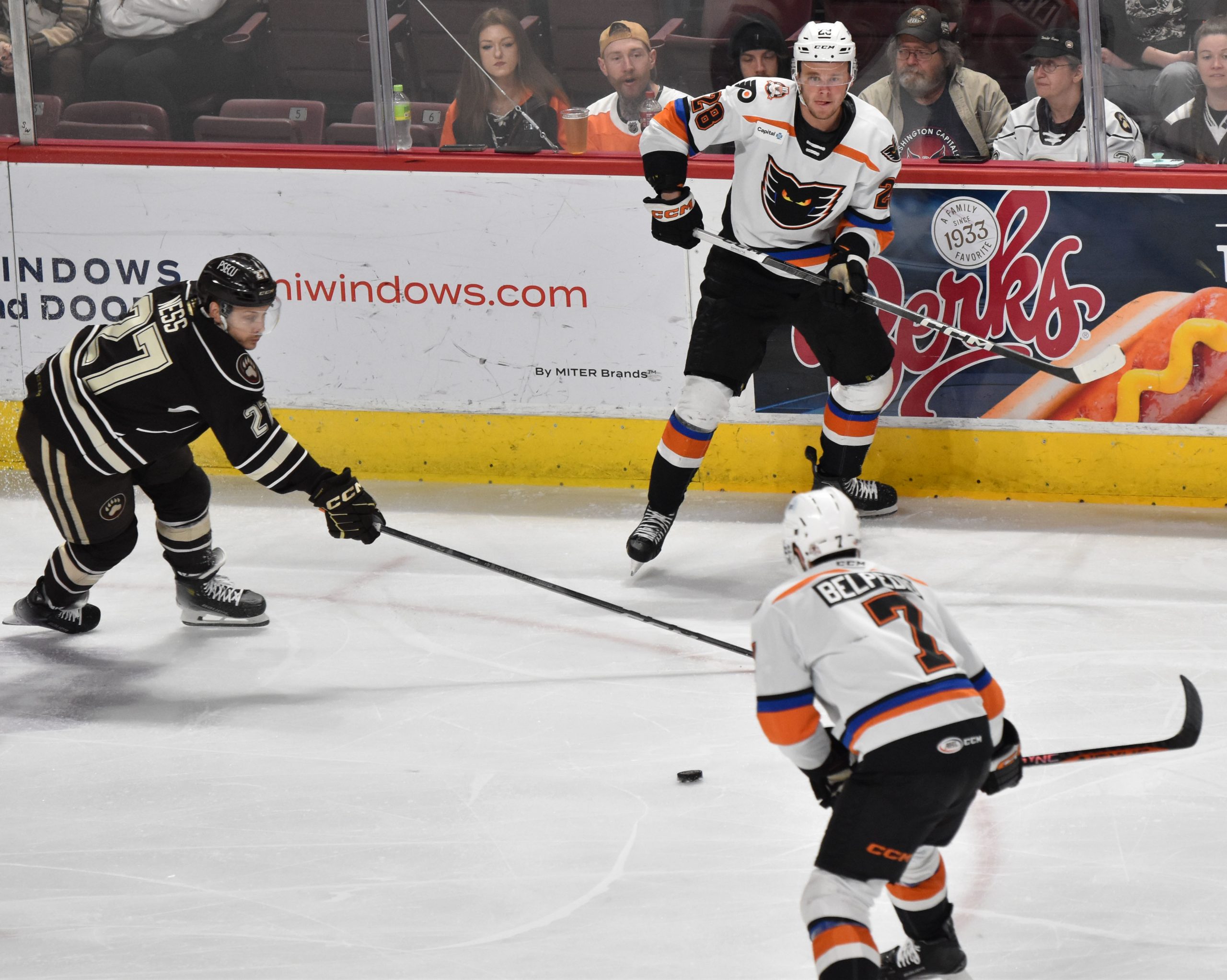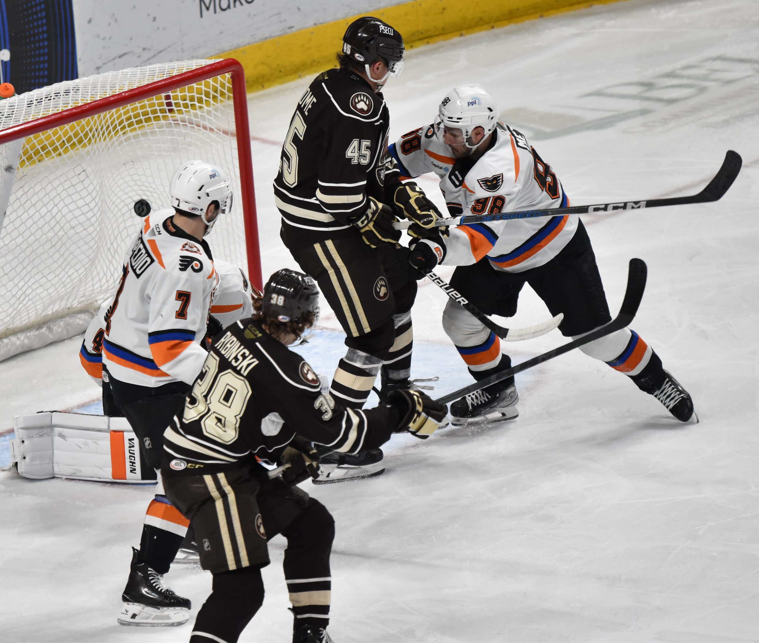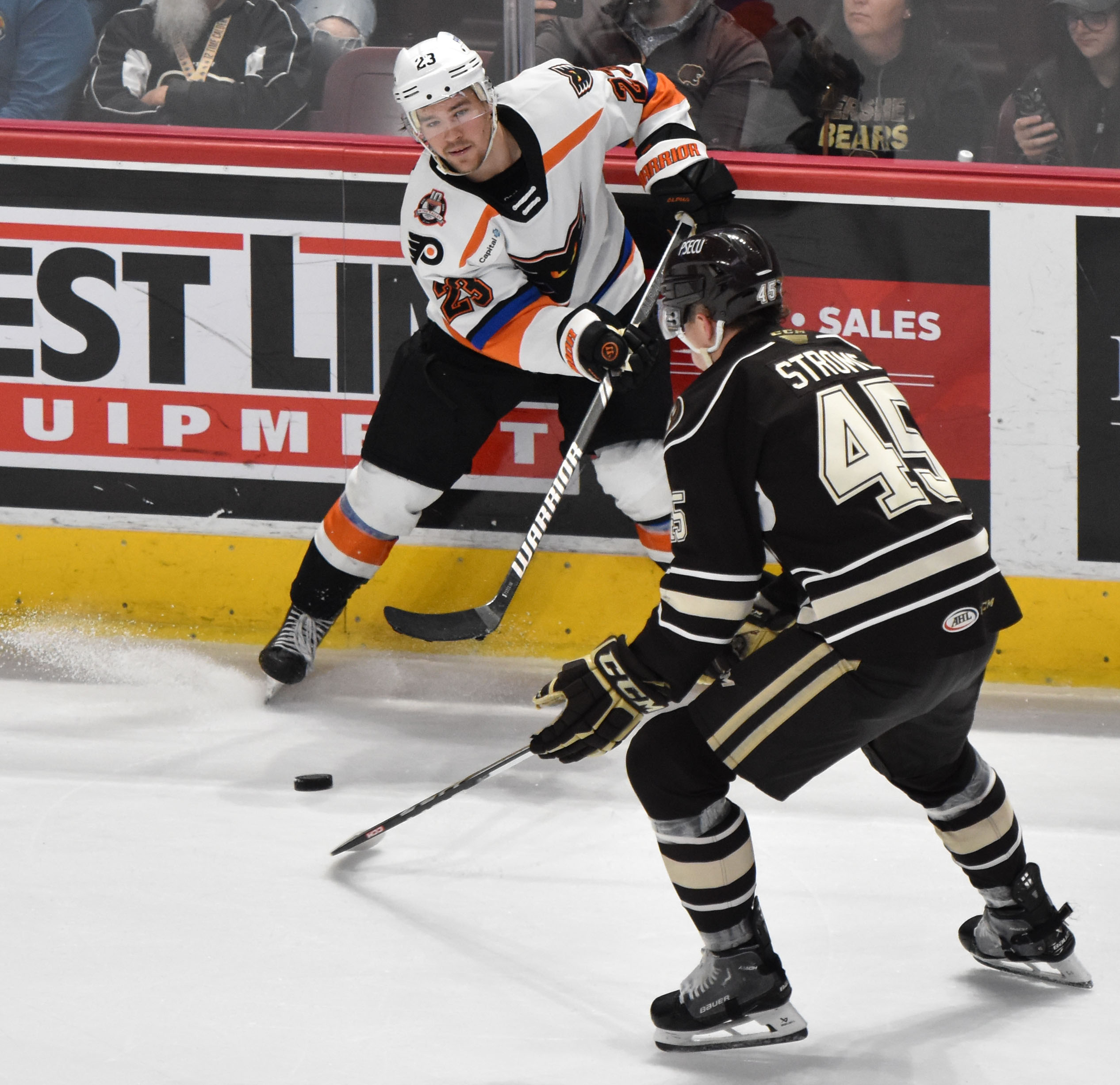The Phantoms had a chance to claw away at Hershey’s lead at 12:27 of the third period when a scramble in front of the net of Shepard led to a Bears player covering the puck in the crease, resulting in a penalty shot. Bobby Brink curled through the right circle and snapped a shot that was kicked out by the right pad of Shepard to preserve the 4-1 lead for the hosts.