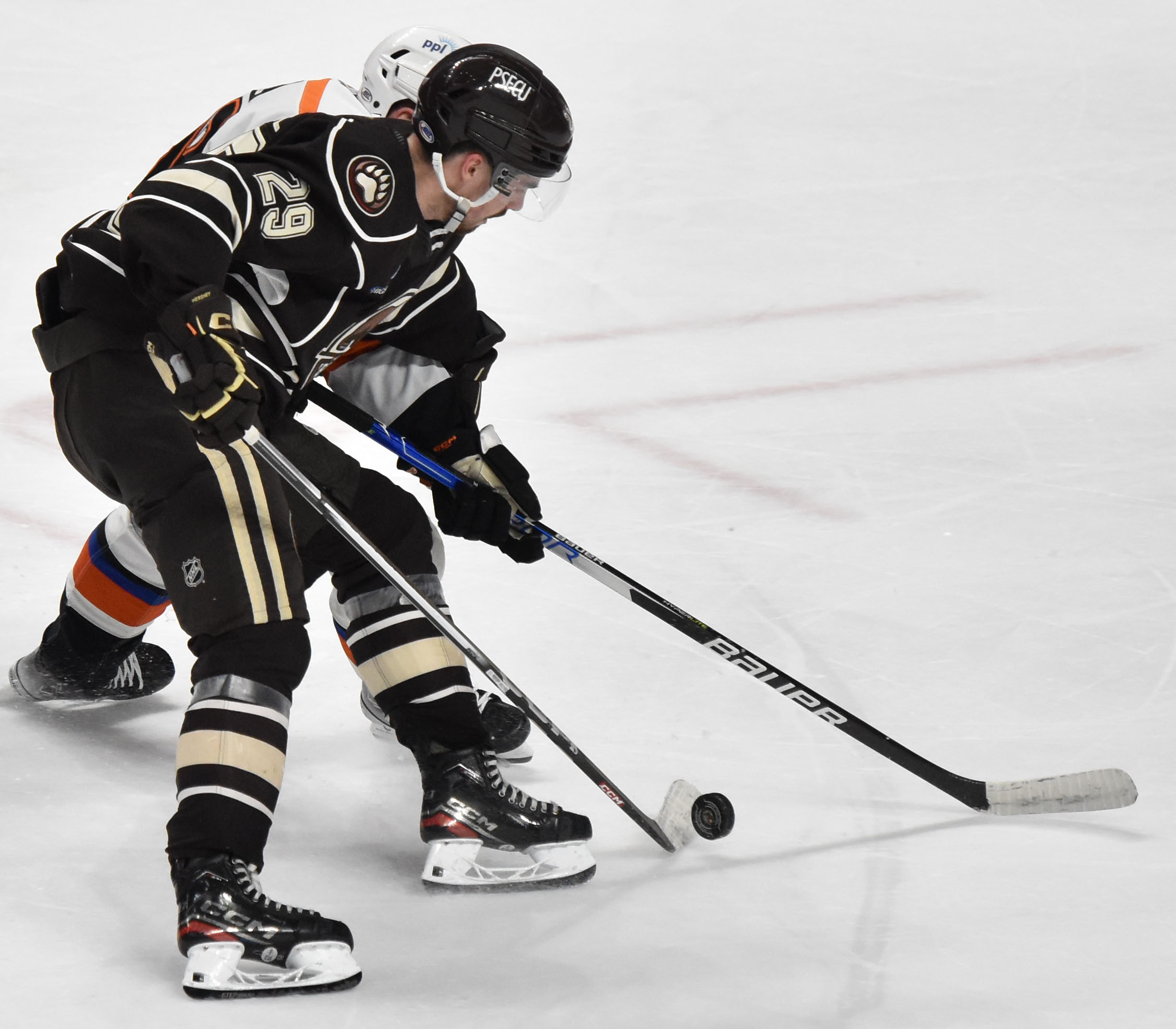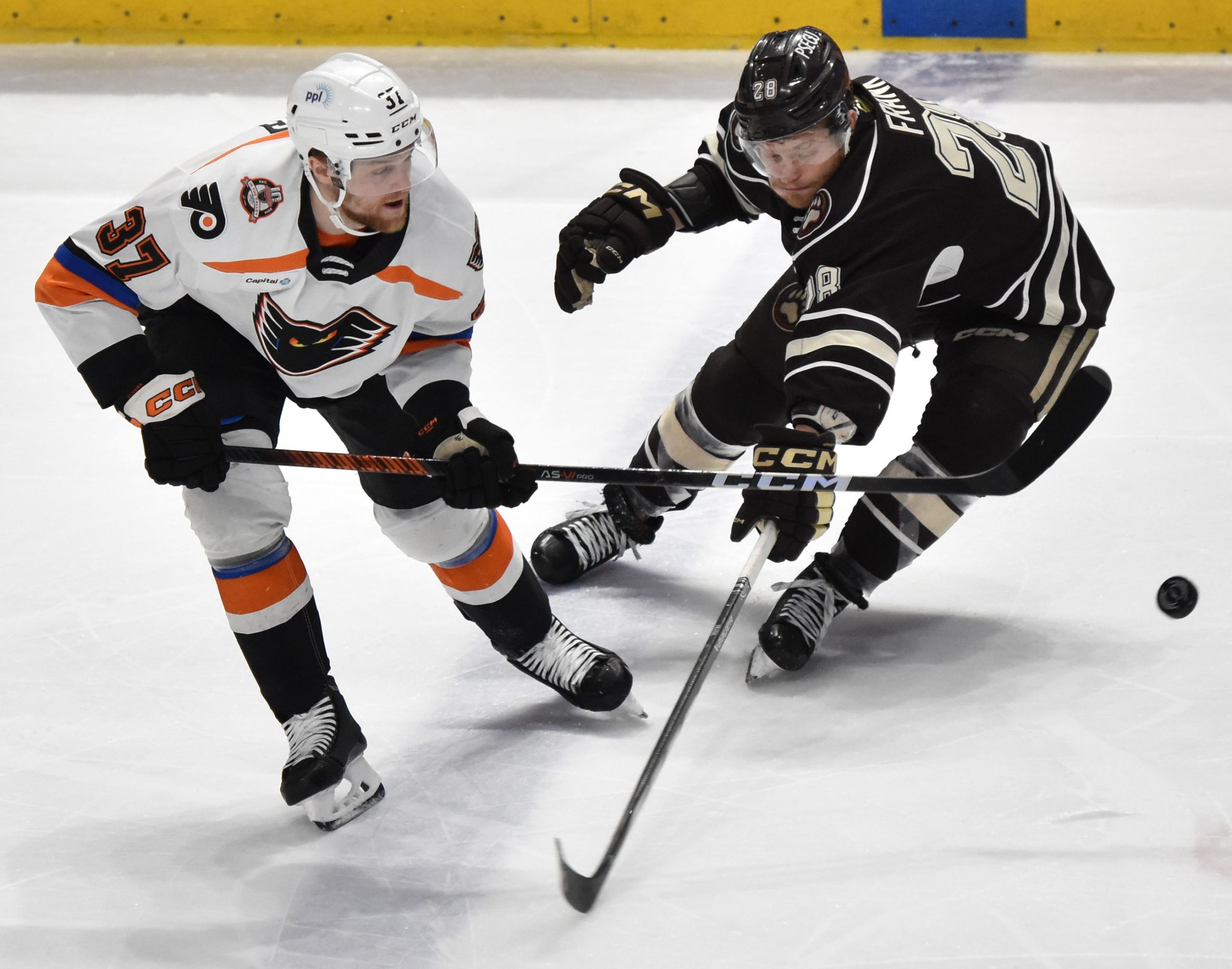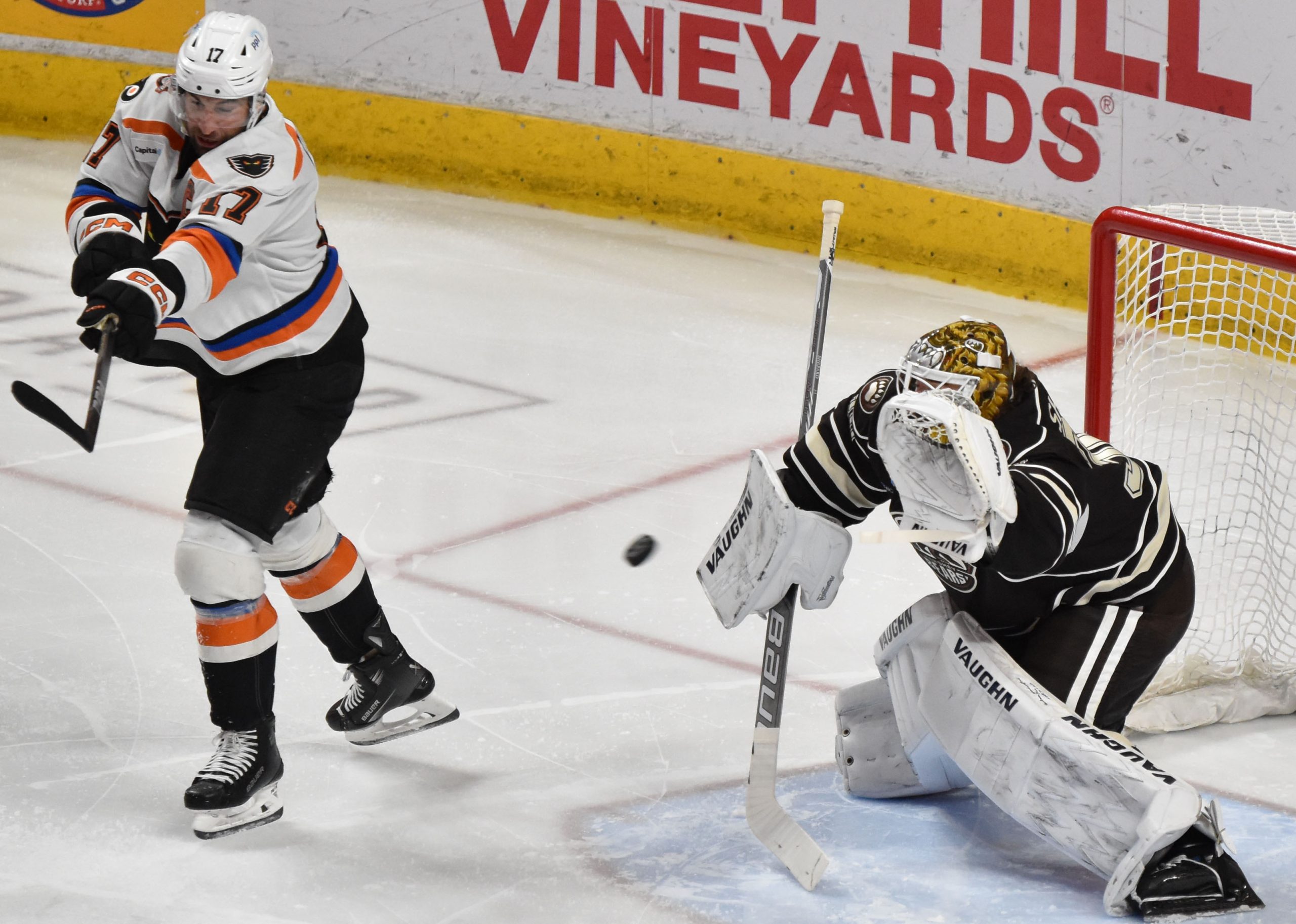The Phantoms had a chance to claw away at Hershey’s lead at 12:27 of the third period when a scramble in front of the net of Shepard led to a Bears player covering the puck in the crease, resulting in a penalty shot. Bobby Brink curled through the right circle and snapped a shot that was kicked out by the right pad of Shepard to preserve the 4-1 lead for the hosts.