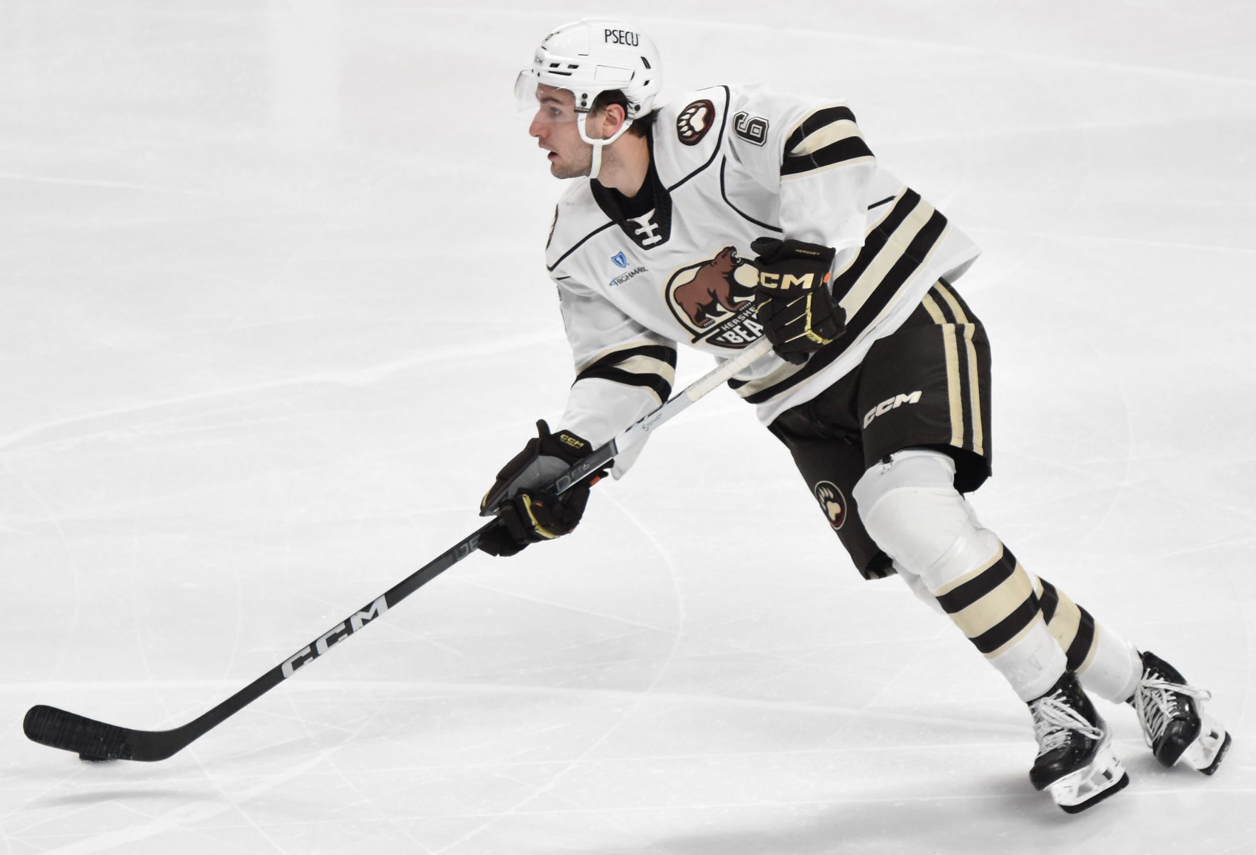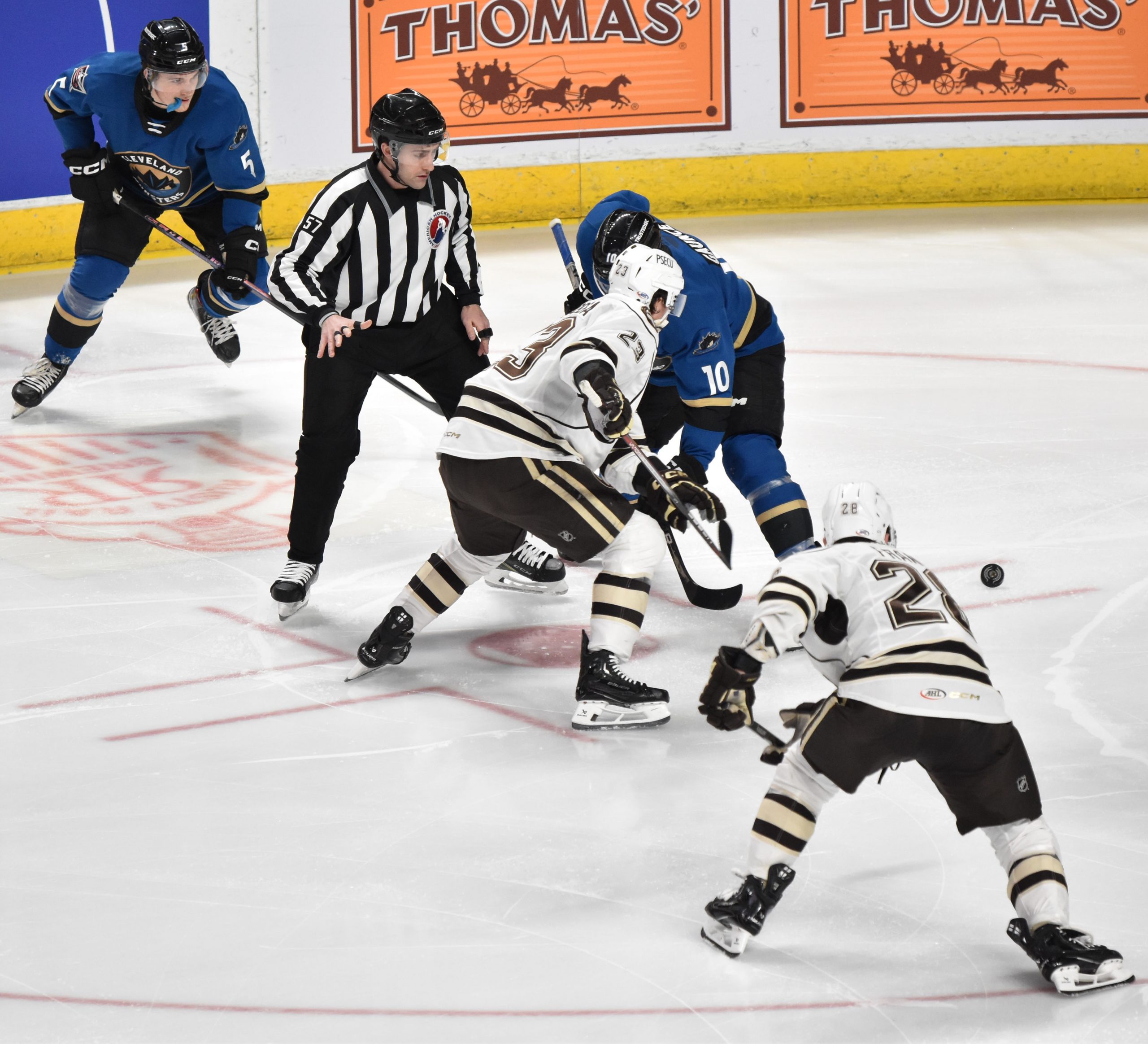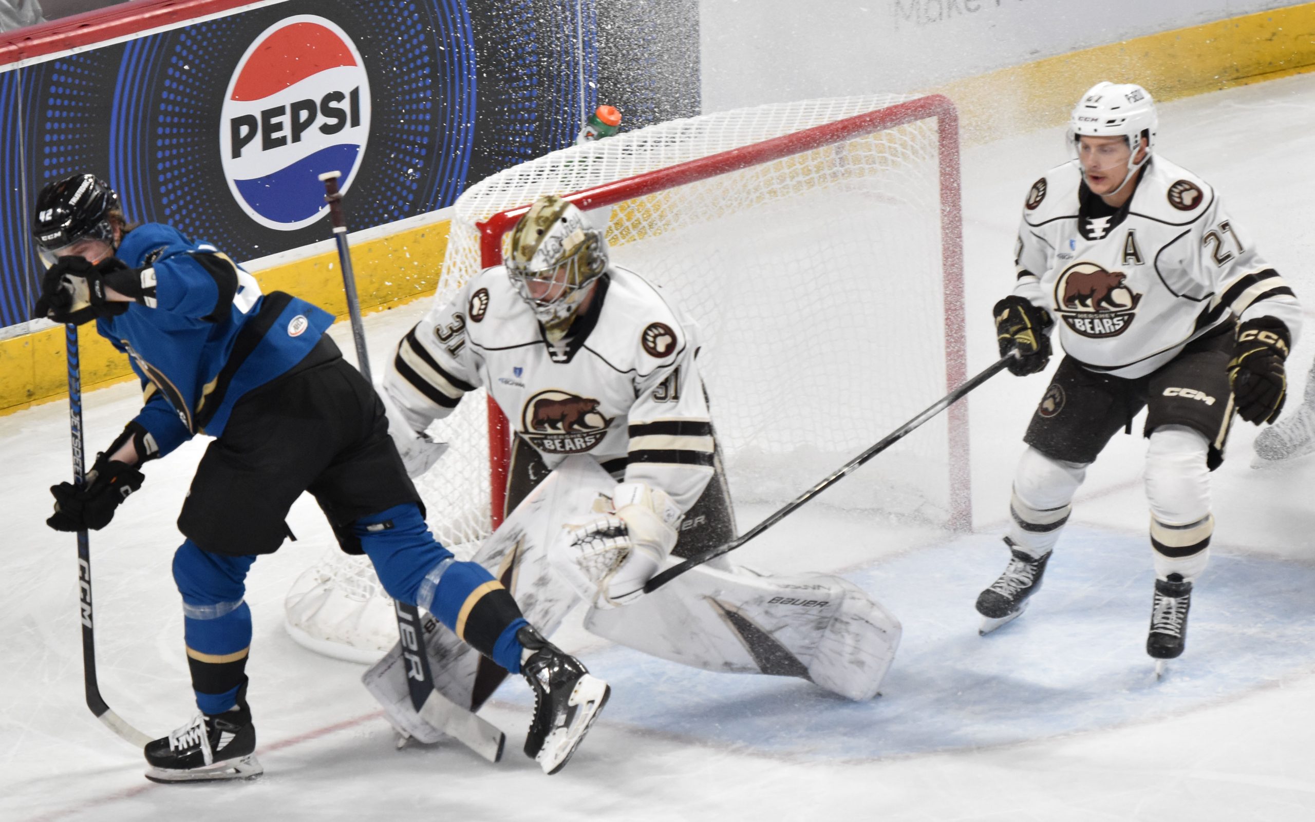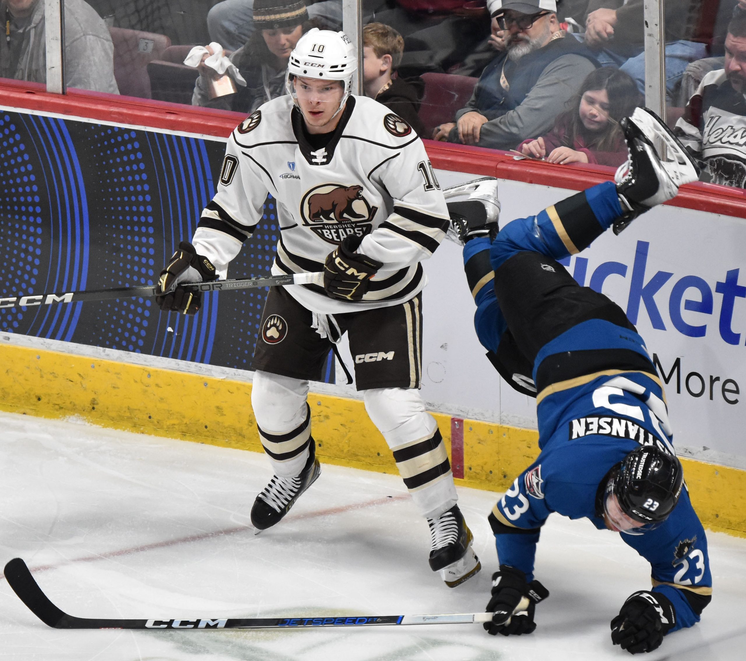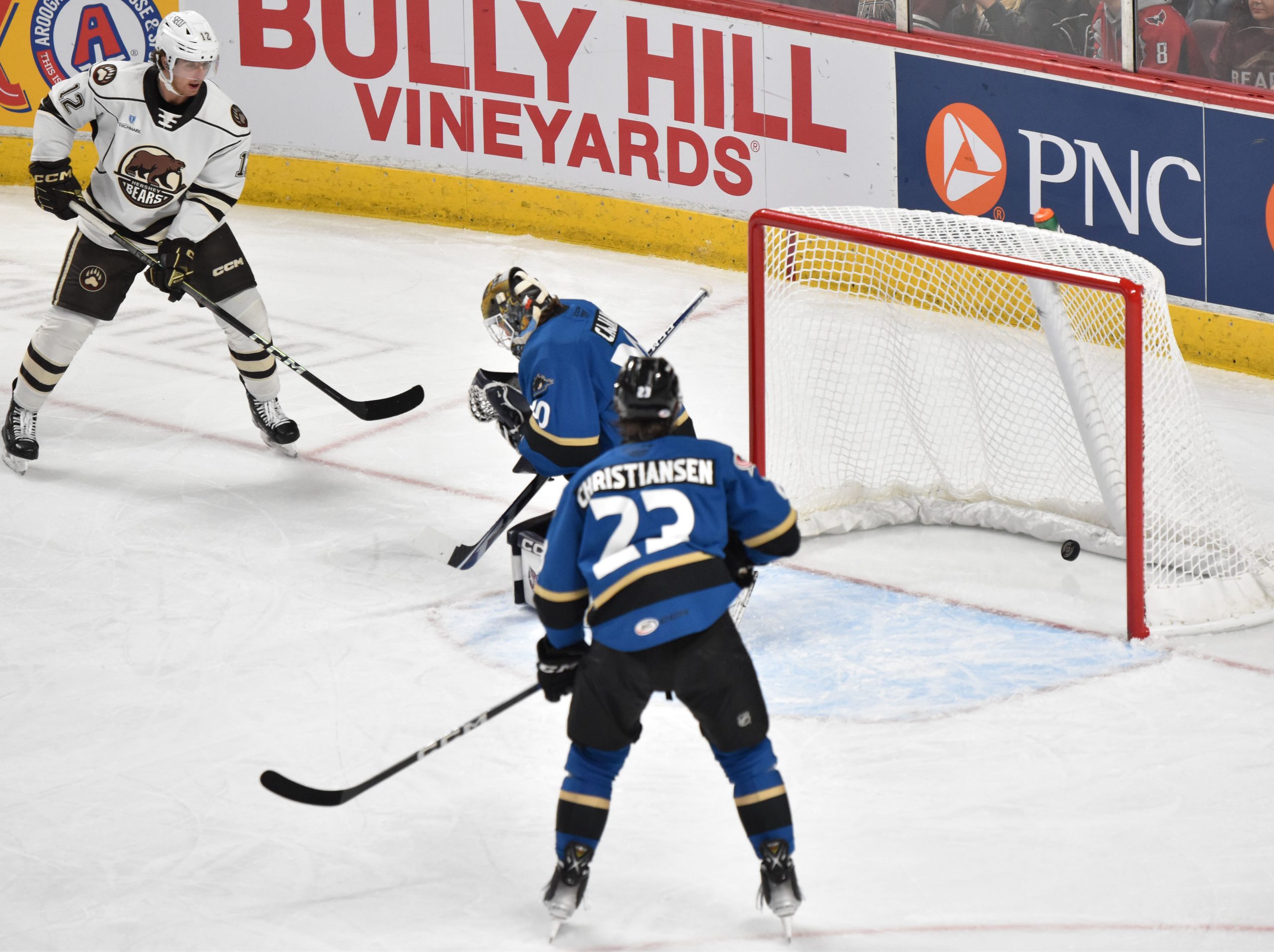 Less than five minutes later, with the Bears again on the power play, Snively dished a pass ahead to Frank in the neutral zone, and the forward sped in before beating Cajan at 9:58 for his 12th of the season. Mike Vecchione drew a secondary helper.