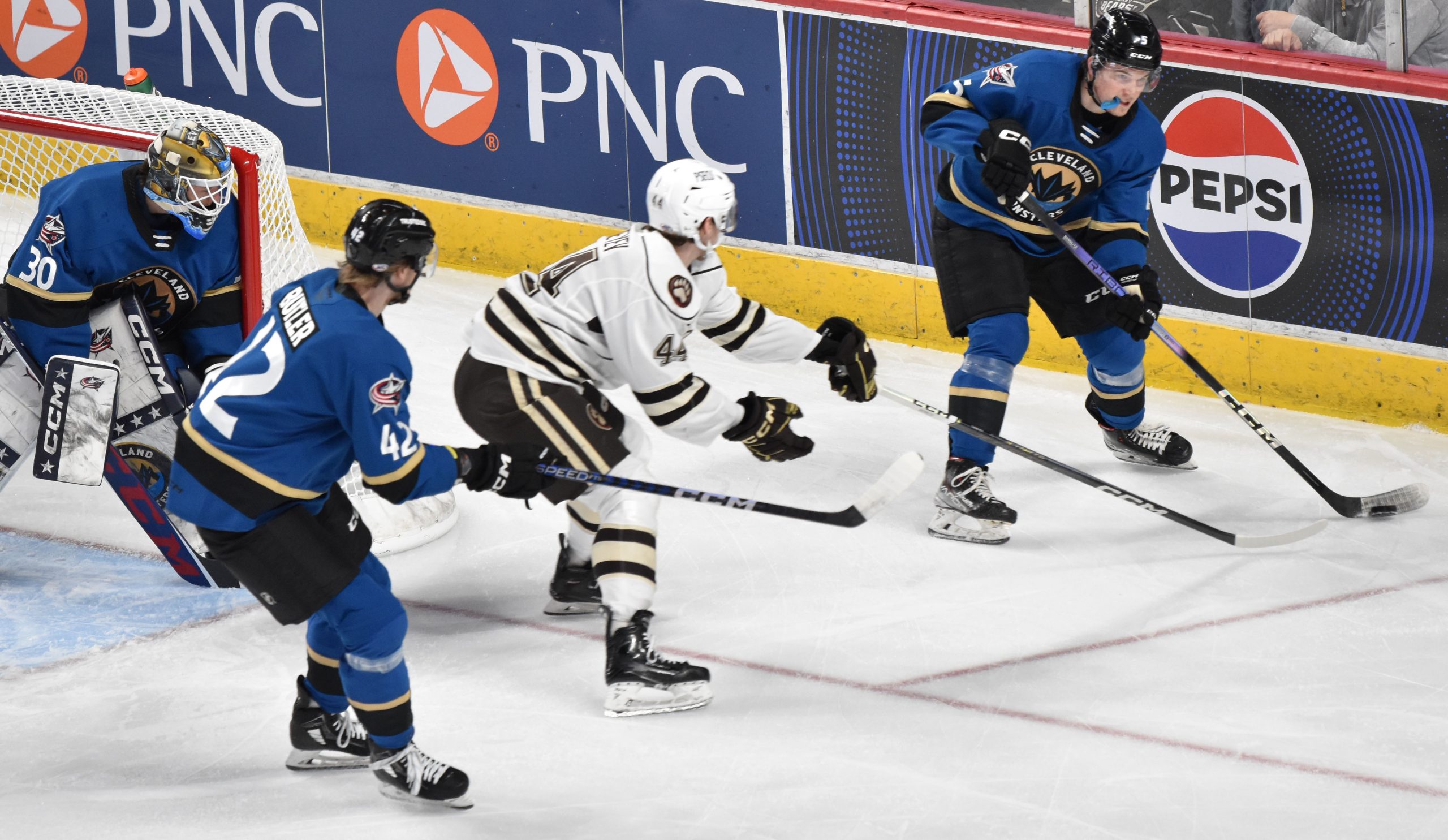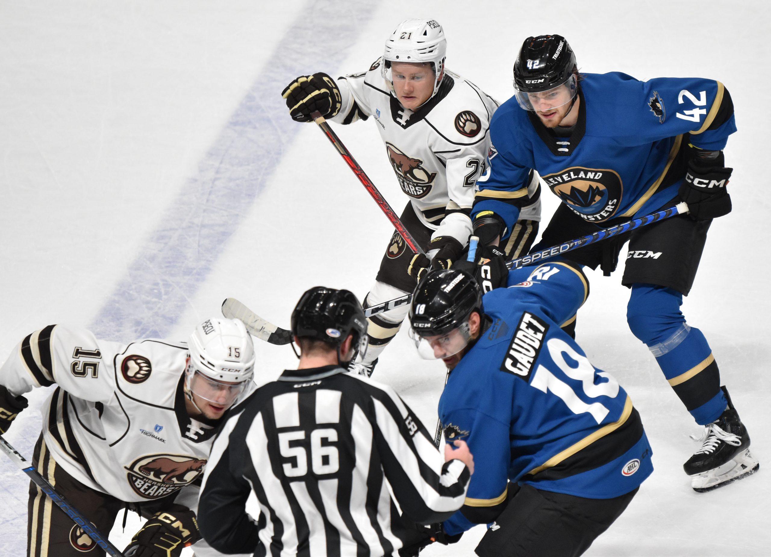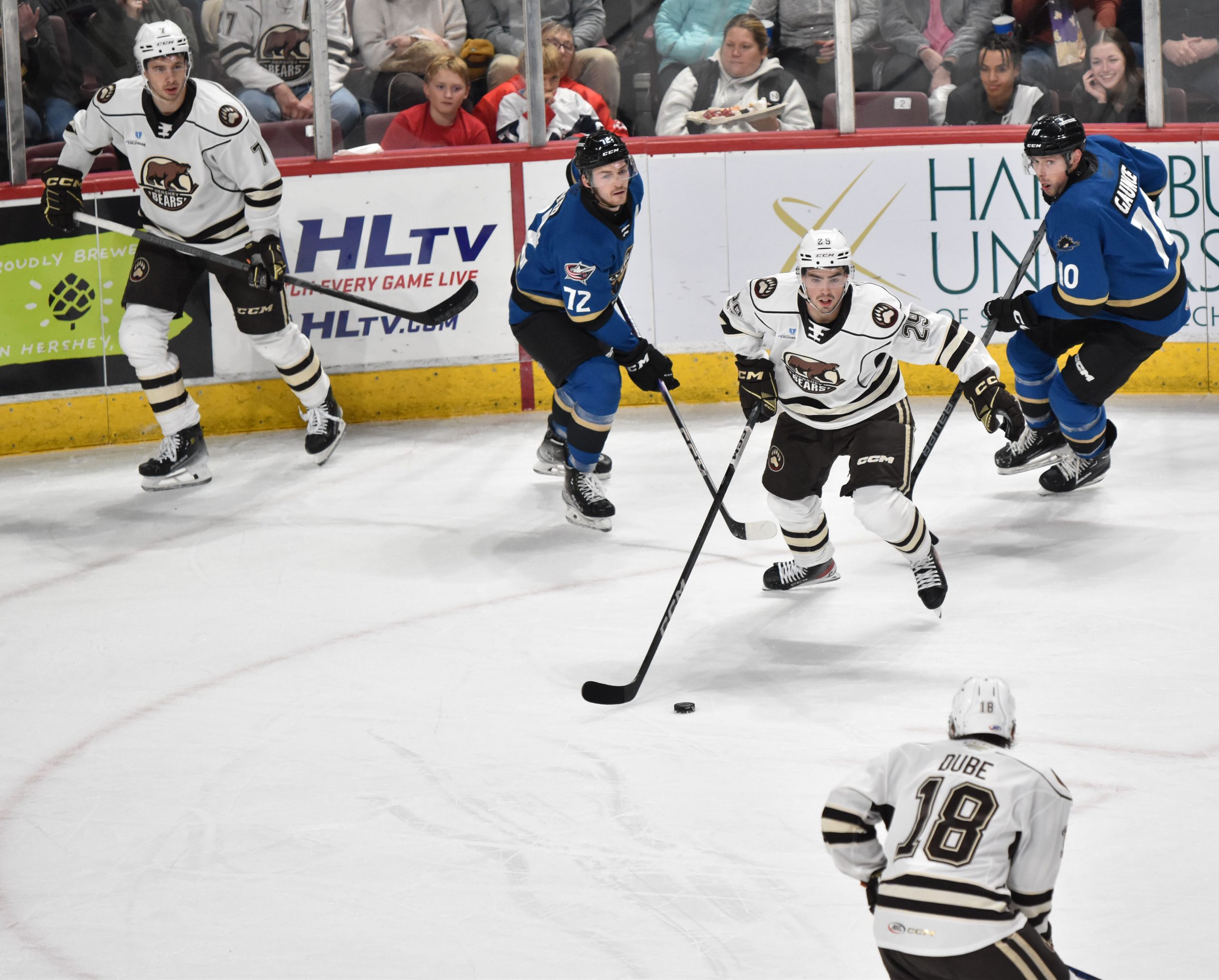 Early in the second frame, the Bears went to a two-man advantage after Cleveland’s Roman Ahcan was sent to the box at 2:12 for elbowing Vecchione. Pierrick Dube added a power-play marker by redirecting Mike Sgarbossa’s wrist shot at 2:58 for his 11th tally of the season. Frank collected his third point of the night with an additional assist.