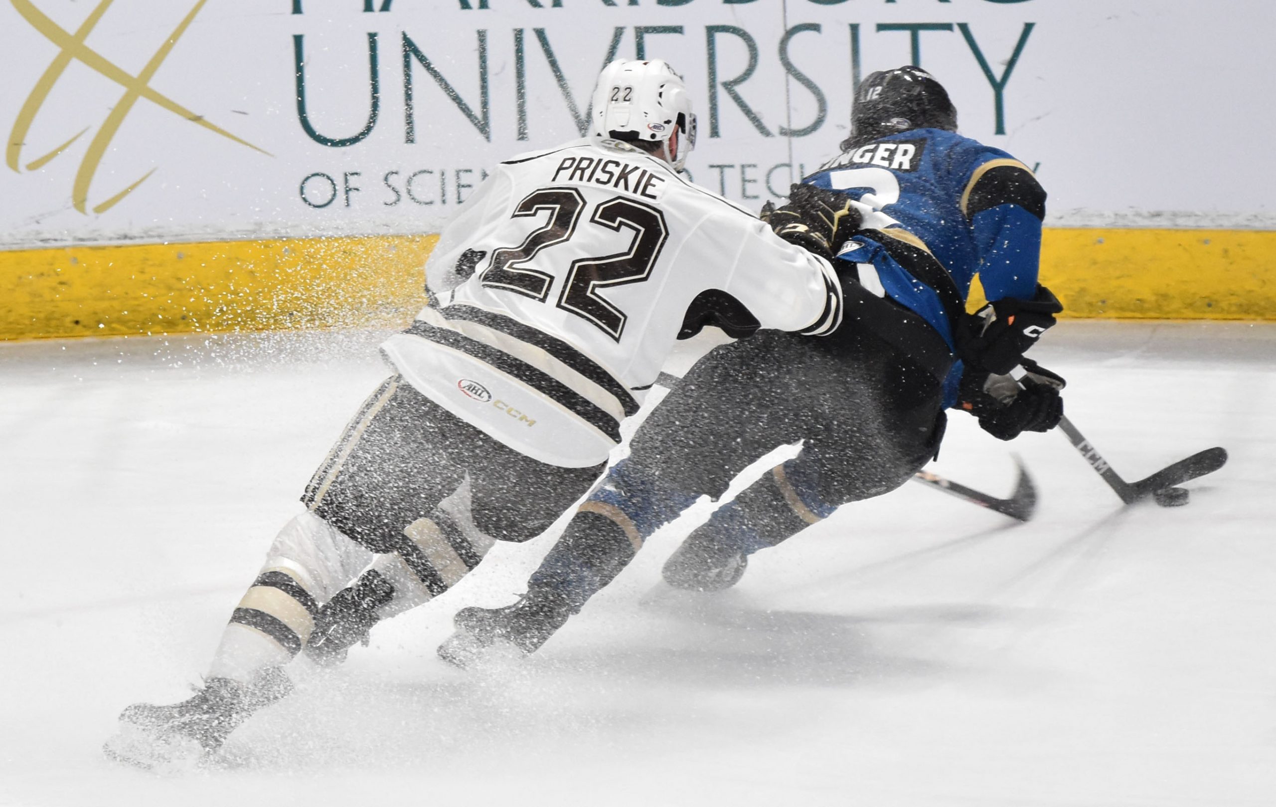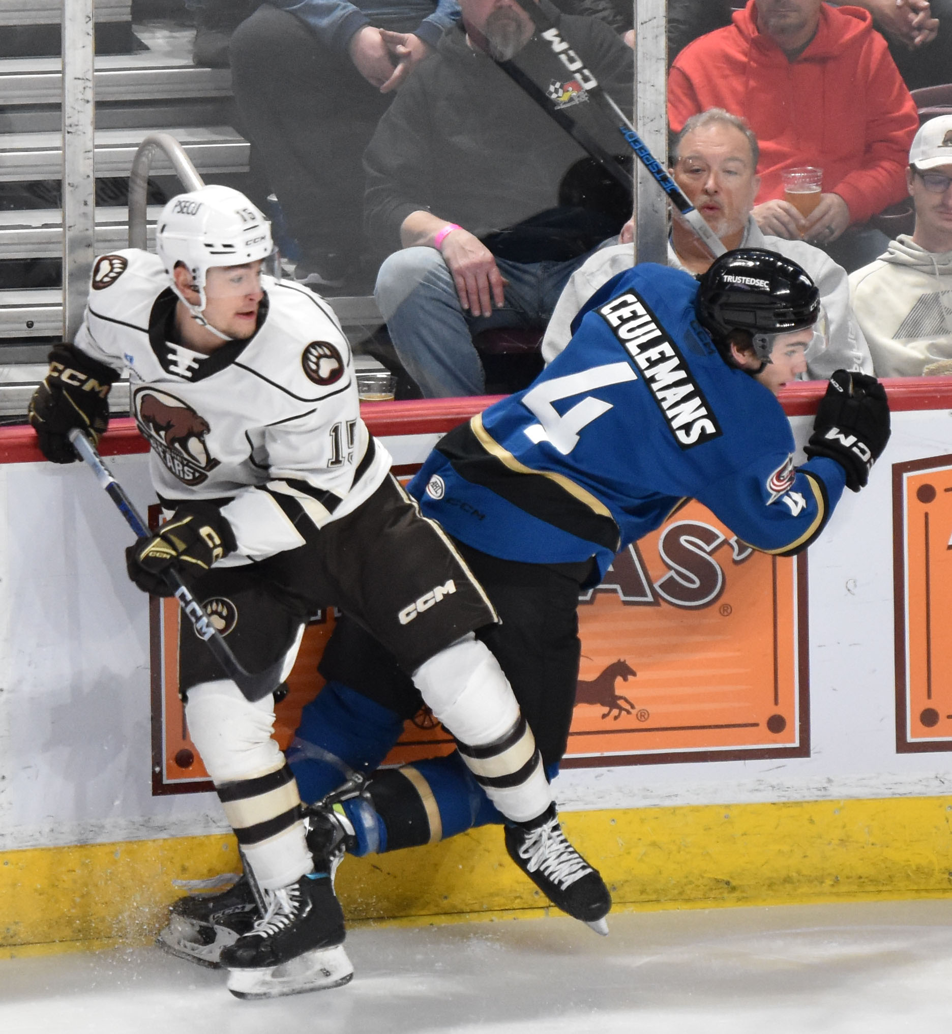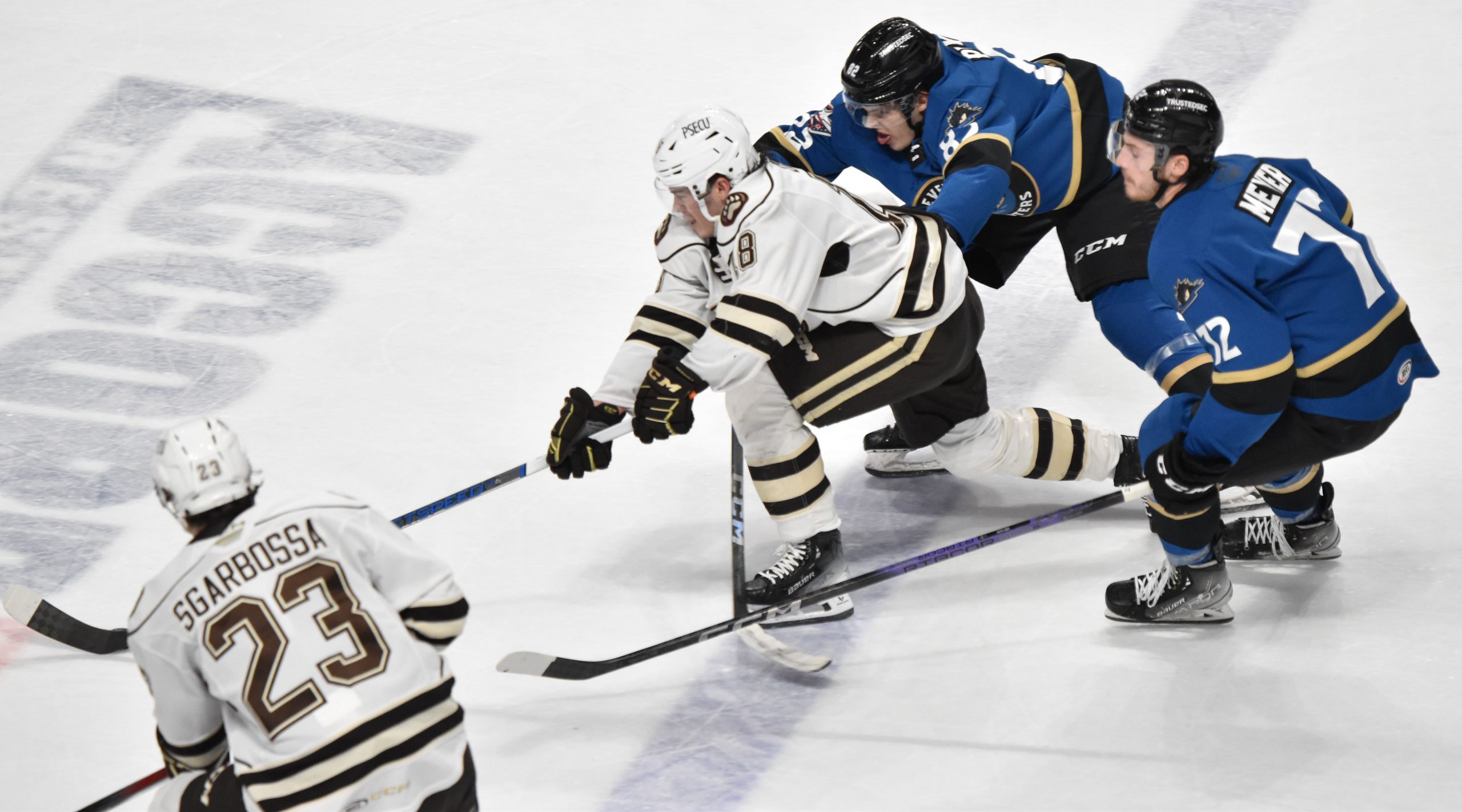 Early in the second frame, the Bears went to a two-man advantage after Cleveland’s Roman Ahcan was sent to the box at 2:12 for elbowing Vecchione. Pierrick Dube added a power-play marker by redirecting Mike Sgarbossa’s wrist shot at 2:58 for his 11th tally of the season. Frank collected his third point of the night with an additional assist.