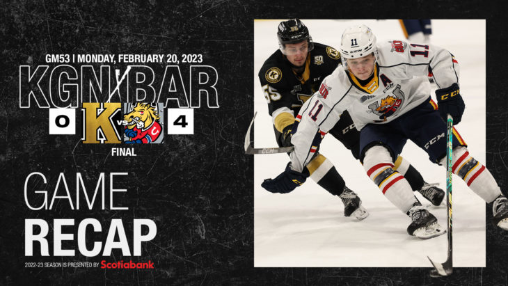 The Kingston Frontenacs (24-26-1-2) dropped a 4-0 decision to the Barrie Colts (31-15-6-2) in a Family Day matinee at Leon’s Centre in the third of four regular season Eastern Conference matchups. Kingston will look to improve on a 2-1-0-0 record in the final game of the series on Mar 24.