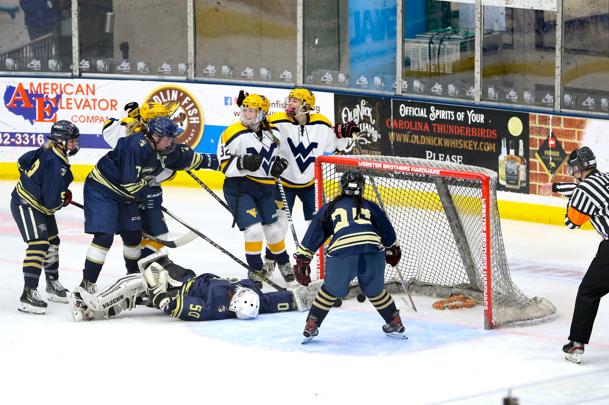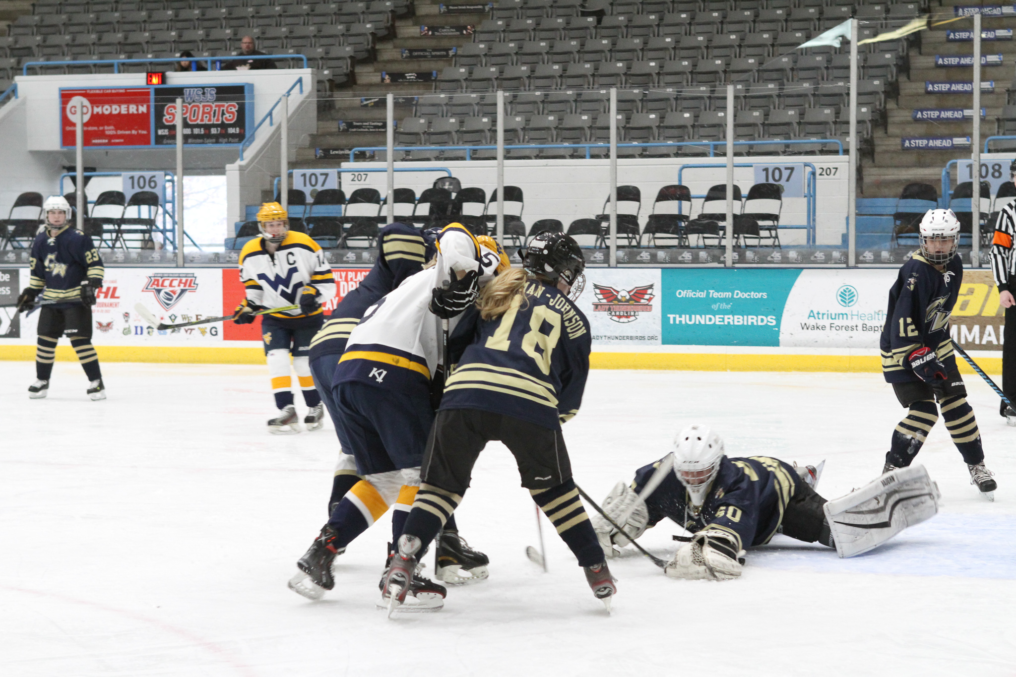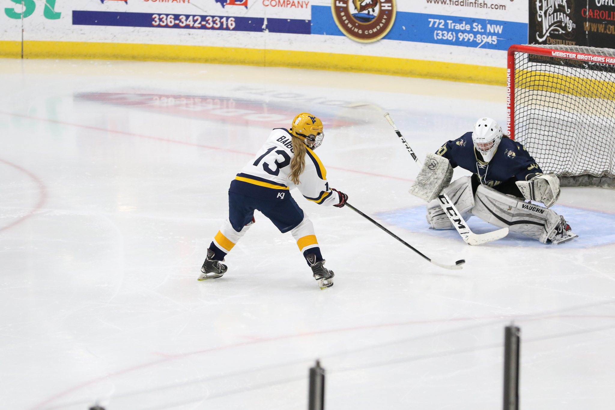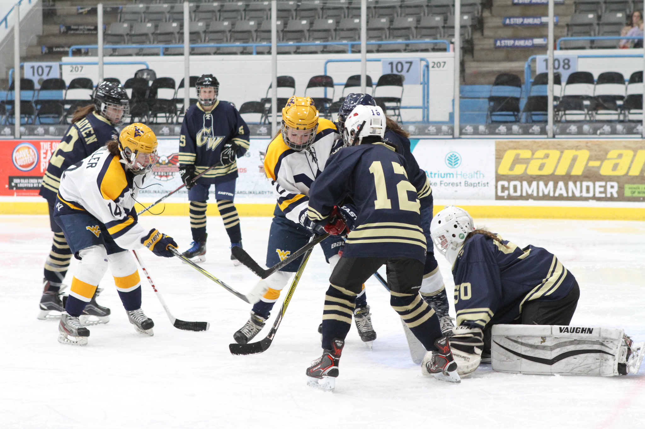 Winston-Salem, NC: While the West Virginia University women’s team defeated the George Washington University women’s team 6-1, the real story of the game was goaltending. Freshman netminder Callie Glass stopped 104 of 110 shots on goal in the second ACCHL D2 women’s semifinal game. Willow Herman, goalie for WVU only faced 18 shots, saving all but one.