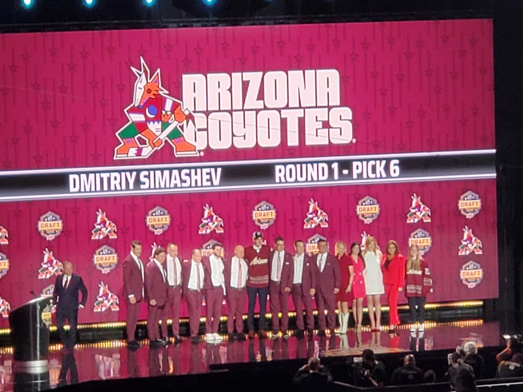 Arizona’s contingent arrived on stage decked in matching burgundy ensembles and made the first Russian selection of the night. From Yaroslav, Russia and from the Russian Junior team, the Coyotes selected 6’4”, 198 lbs. defenseman Dimitry Simashev. It would be the first of two Russians the Coyotes would select during round one.