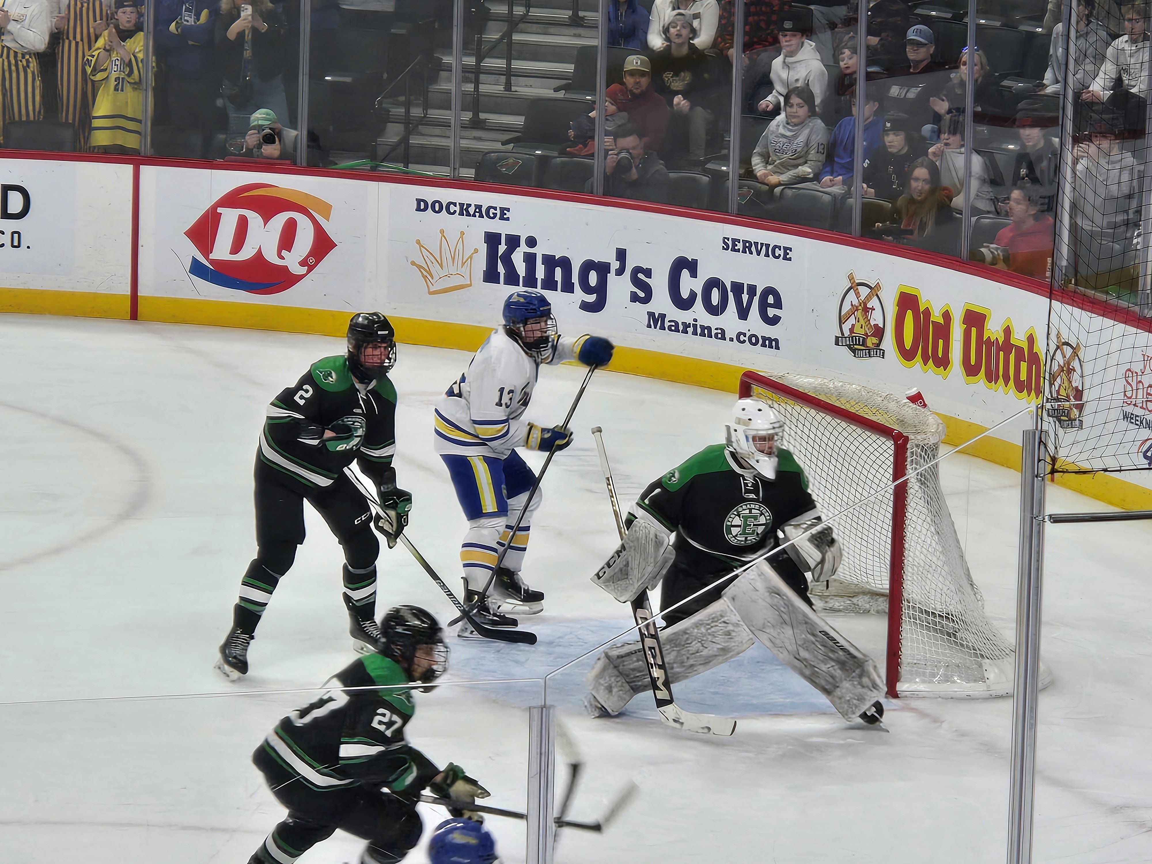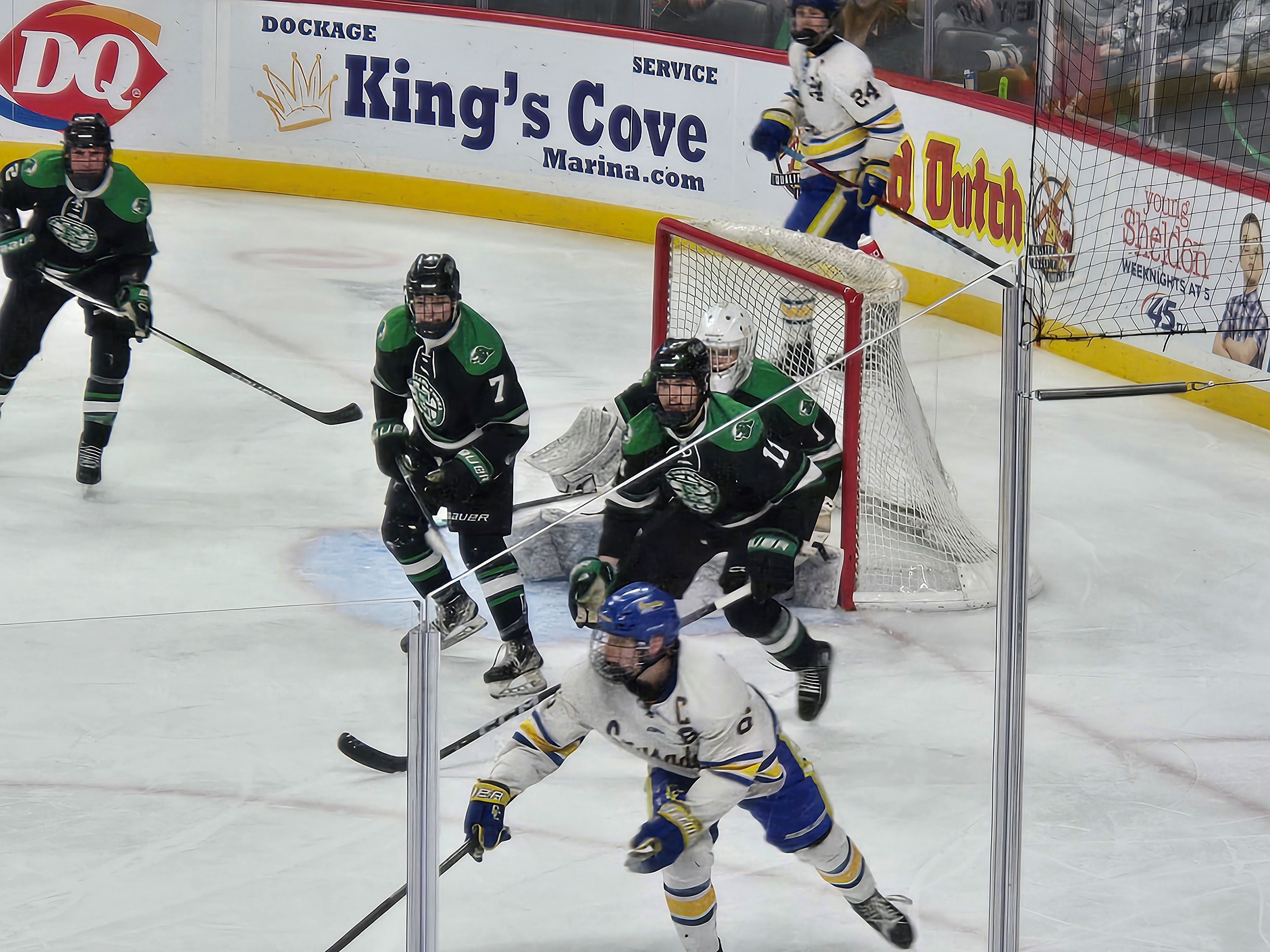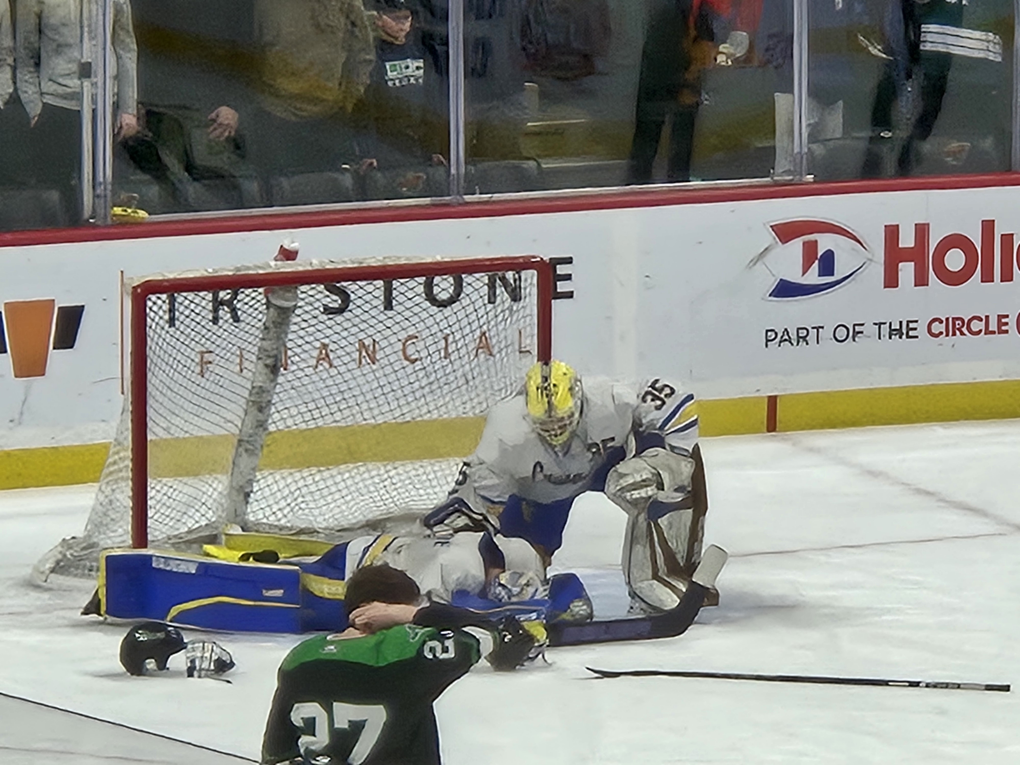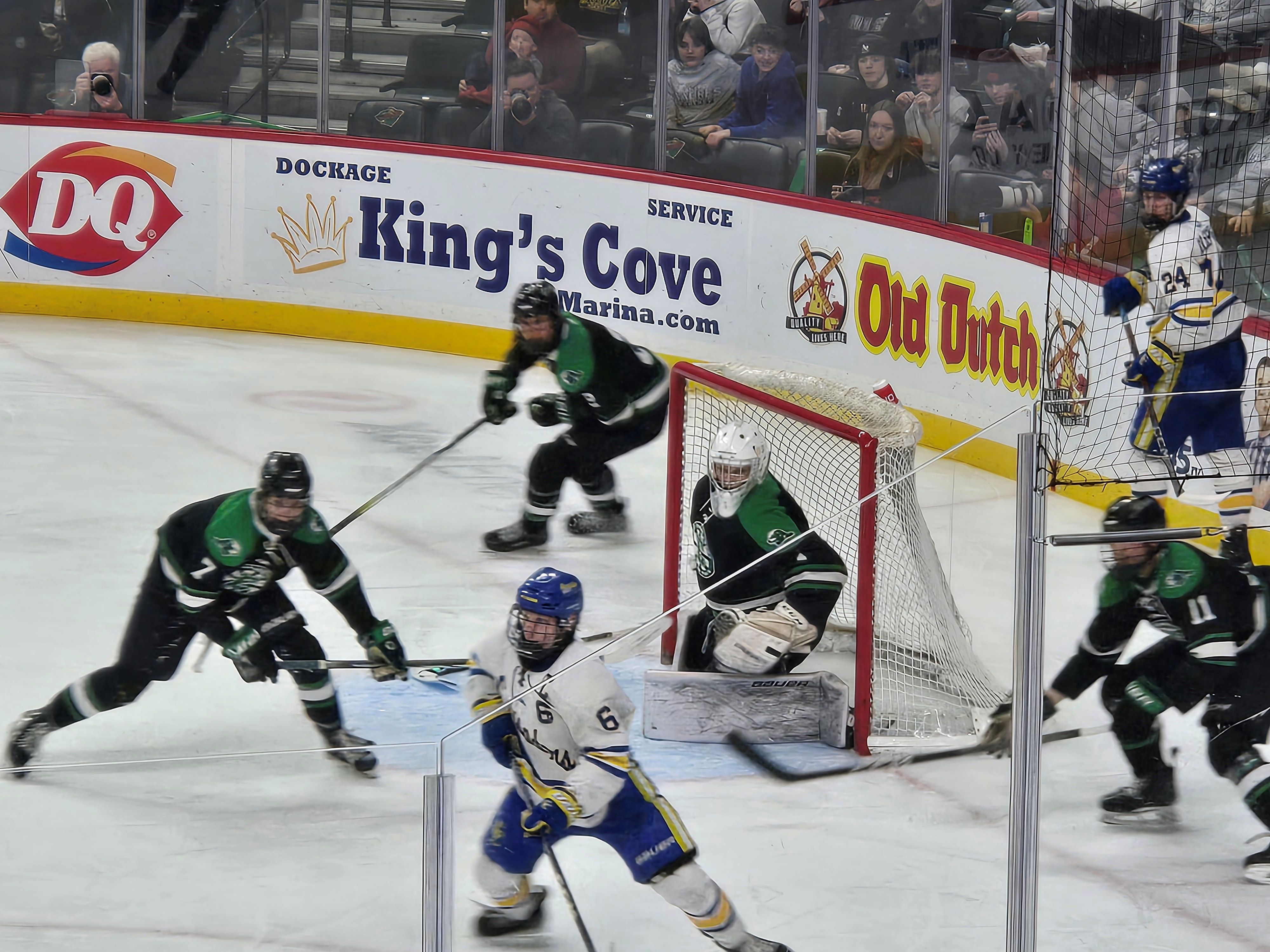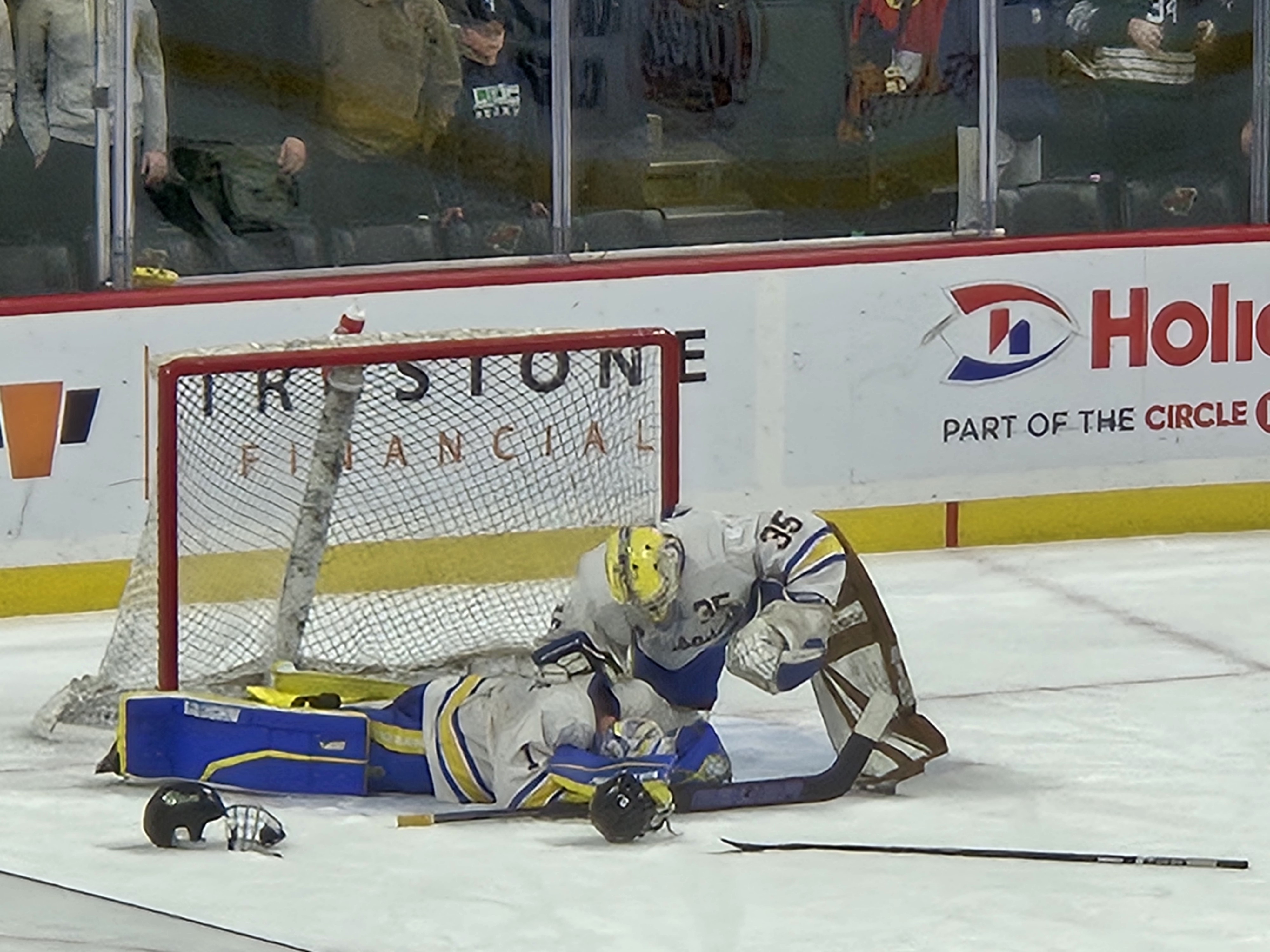 That’s when Freshman sniper Bo Schmidt tied the game with just 47 seconds left. His drive from the left dot eluded Schindele’s pads setting off a frenzy in the arena. Caden Johnson and John Hirschfeld had the helpers.