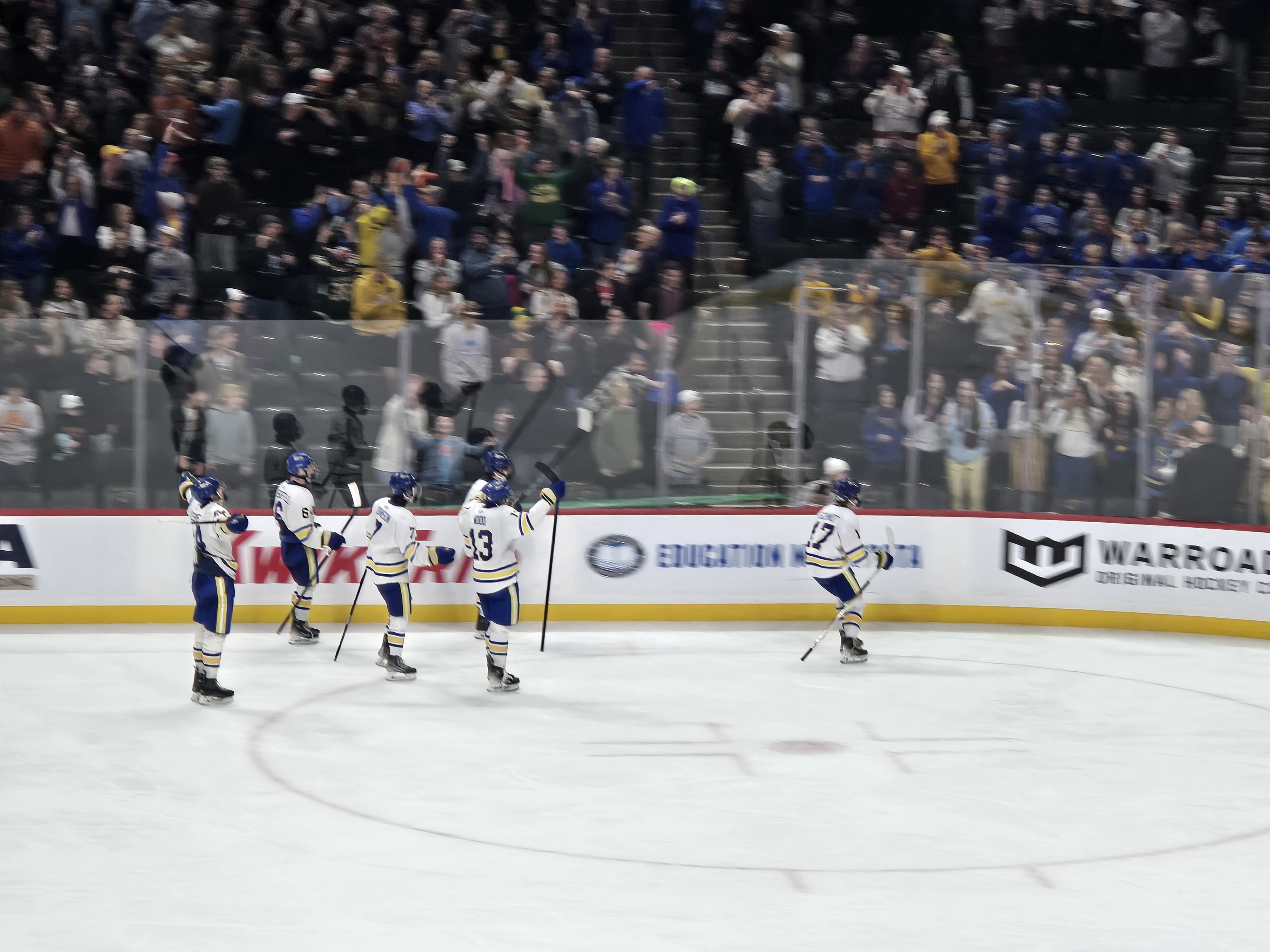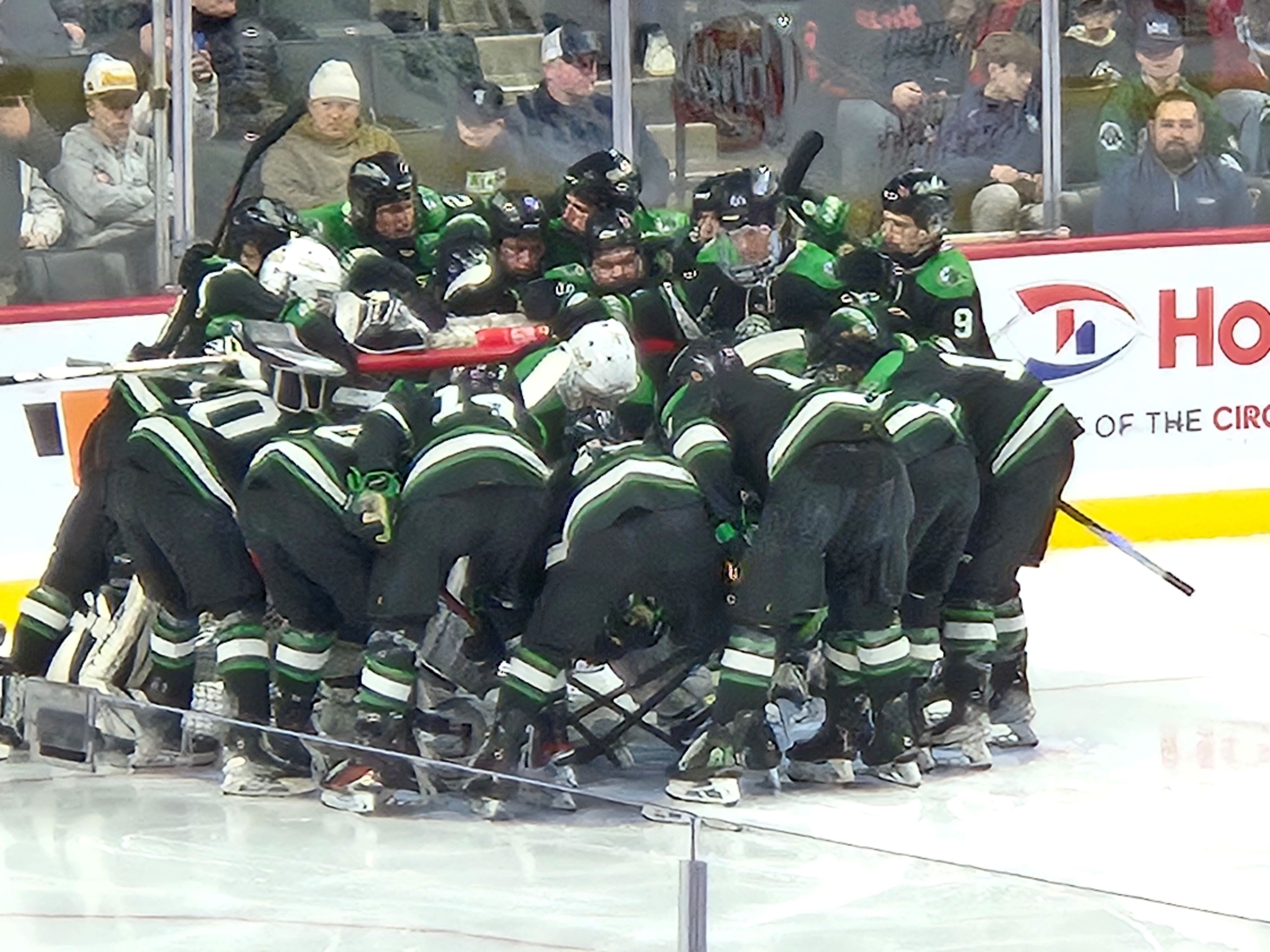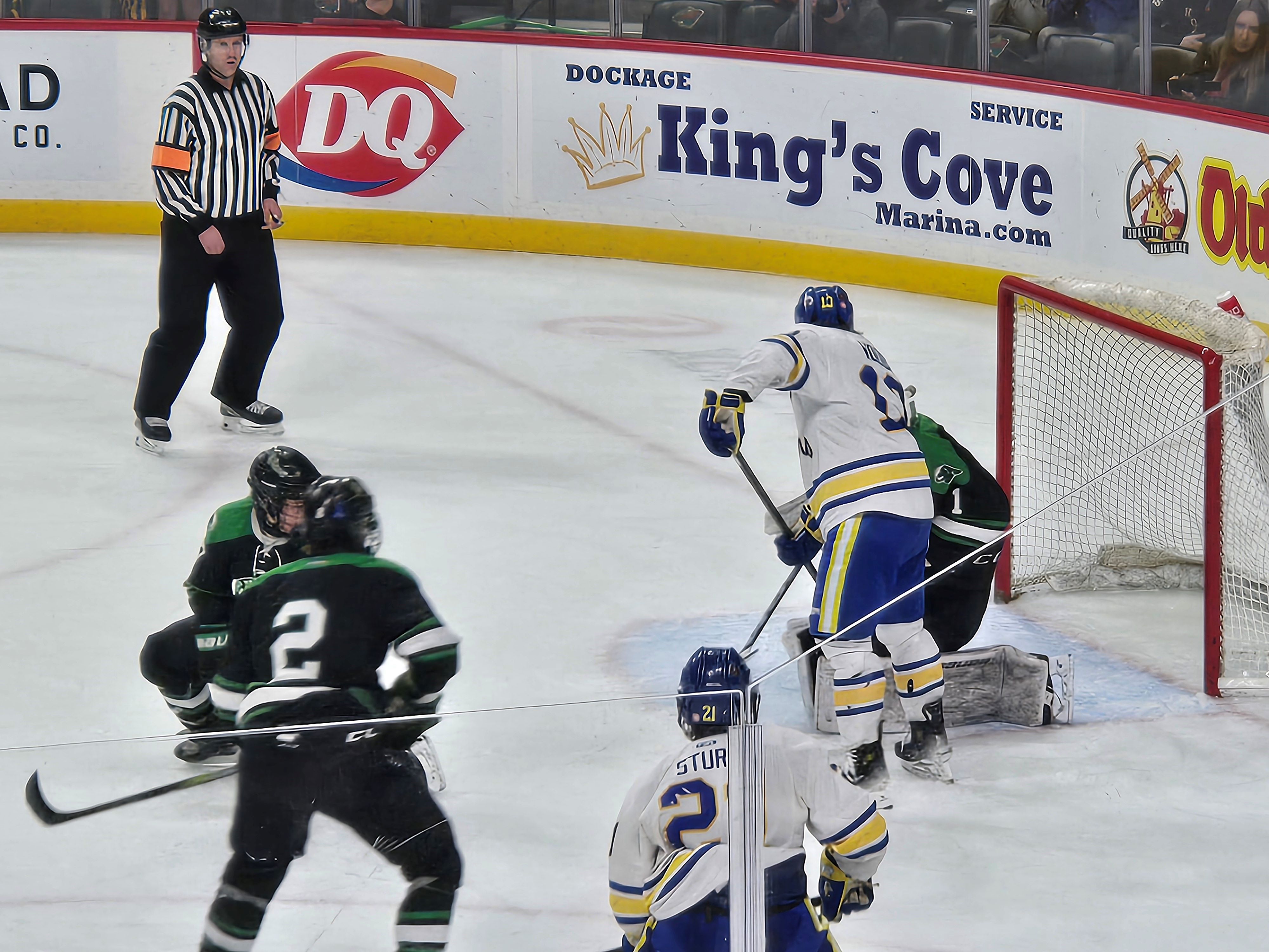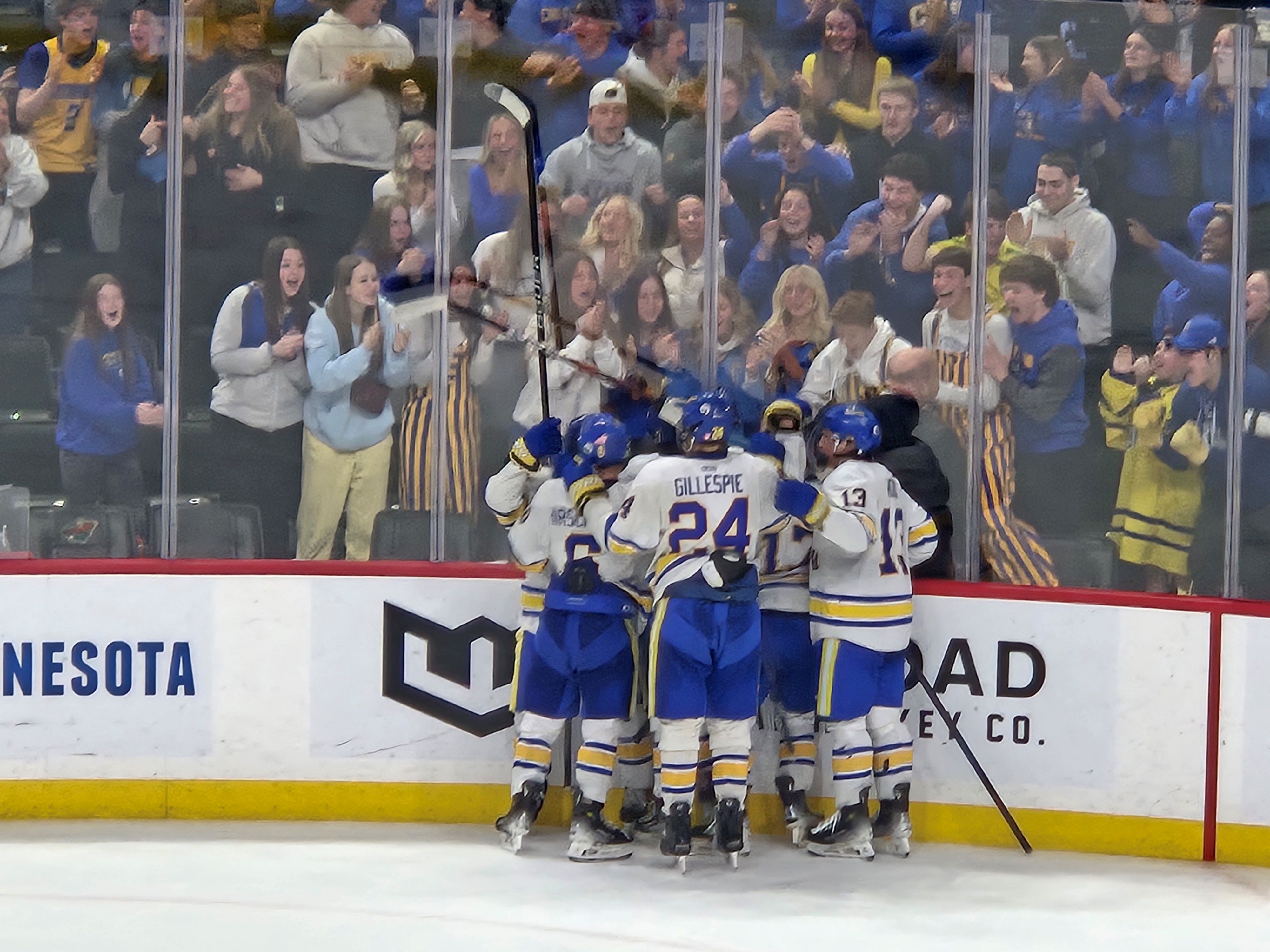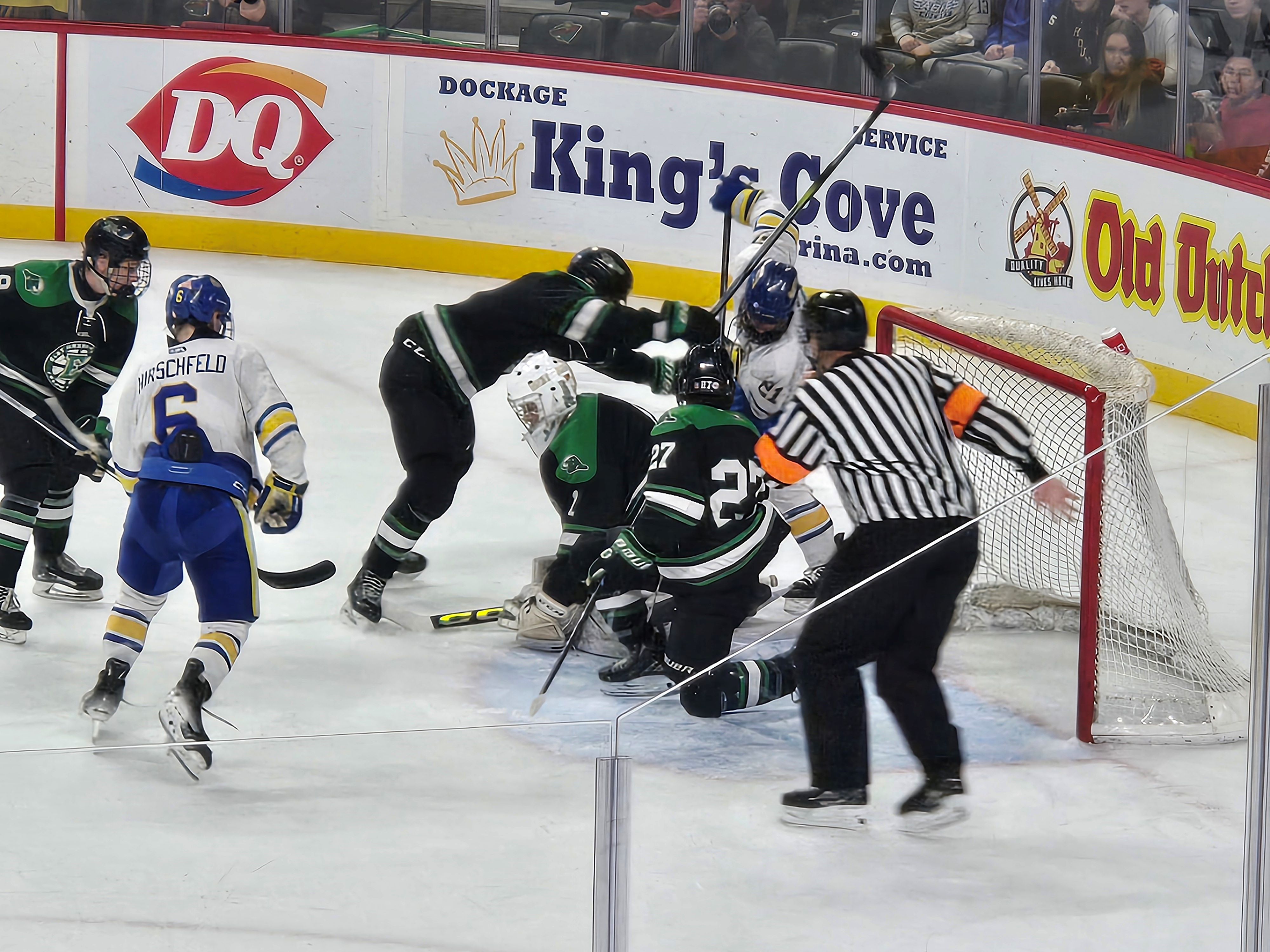 That’s when Freshman sniper Bo Schmidt tied the game with just 47 seconds left. His drive from the left dot eluded Schindele’s pads setting off a frenzy in the arena. Caden Johnson and John Hirschfeld had the helpers.