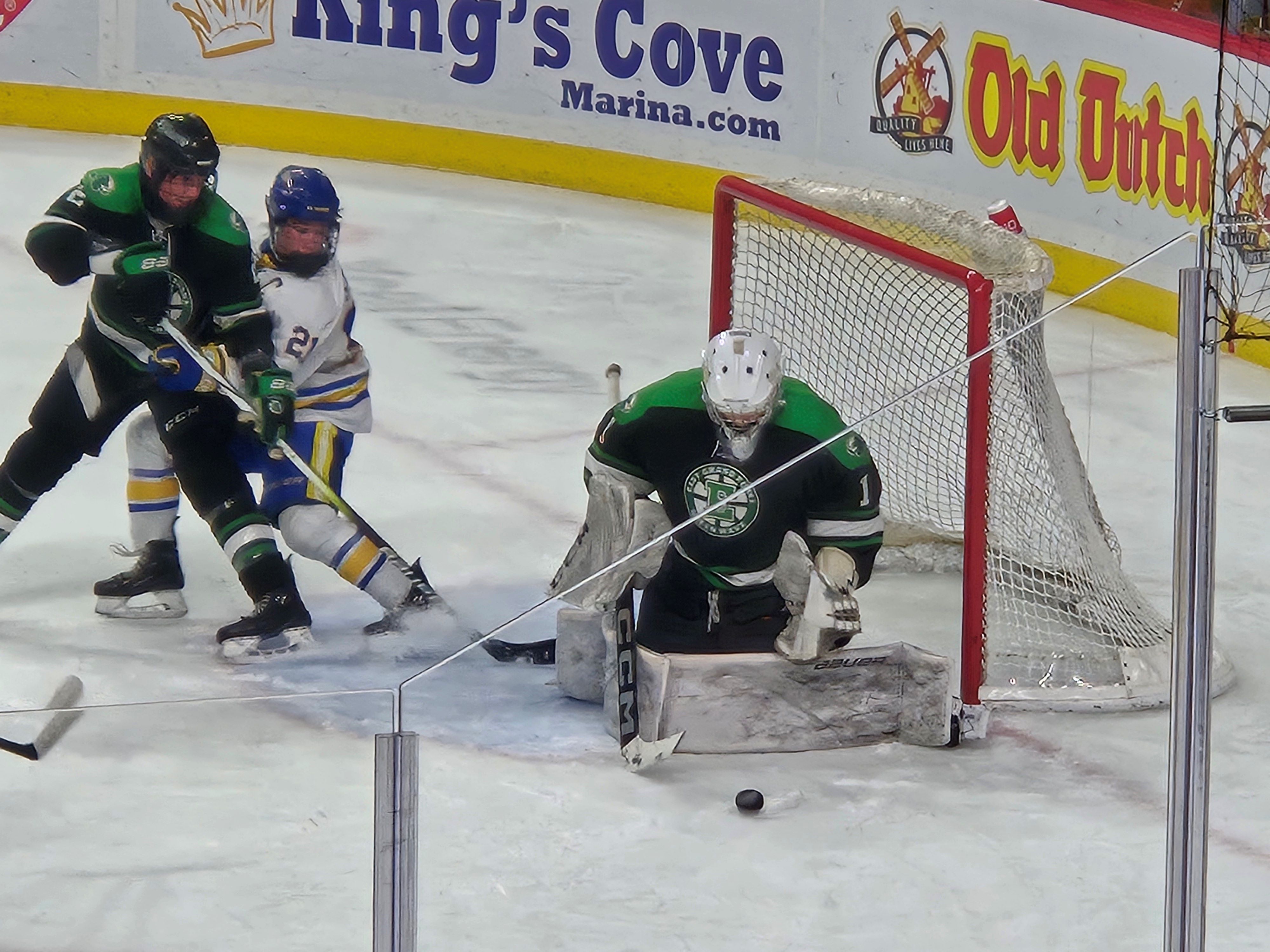 As the game came to a close with just five minutes remaining, East Grand Forks goaltender Noah Schindele hadto be sharp with a series of saves to keep the slim lead.