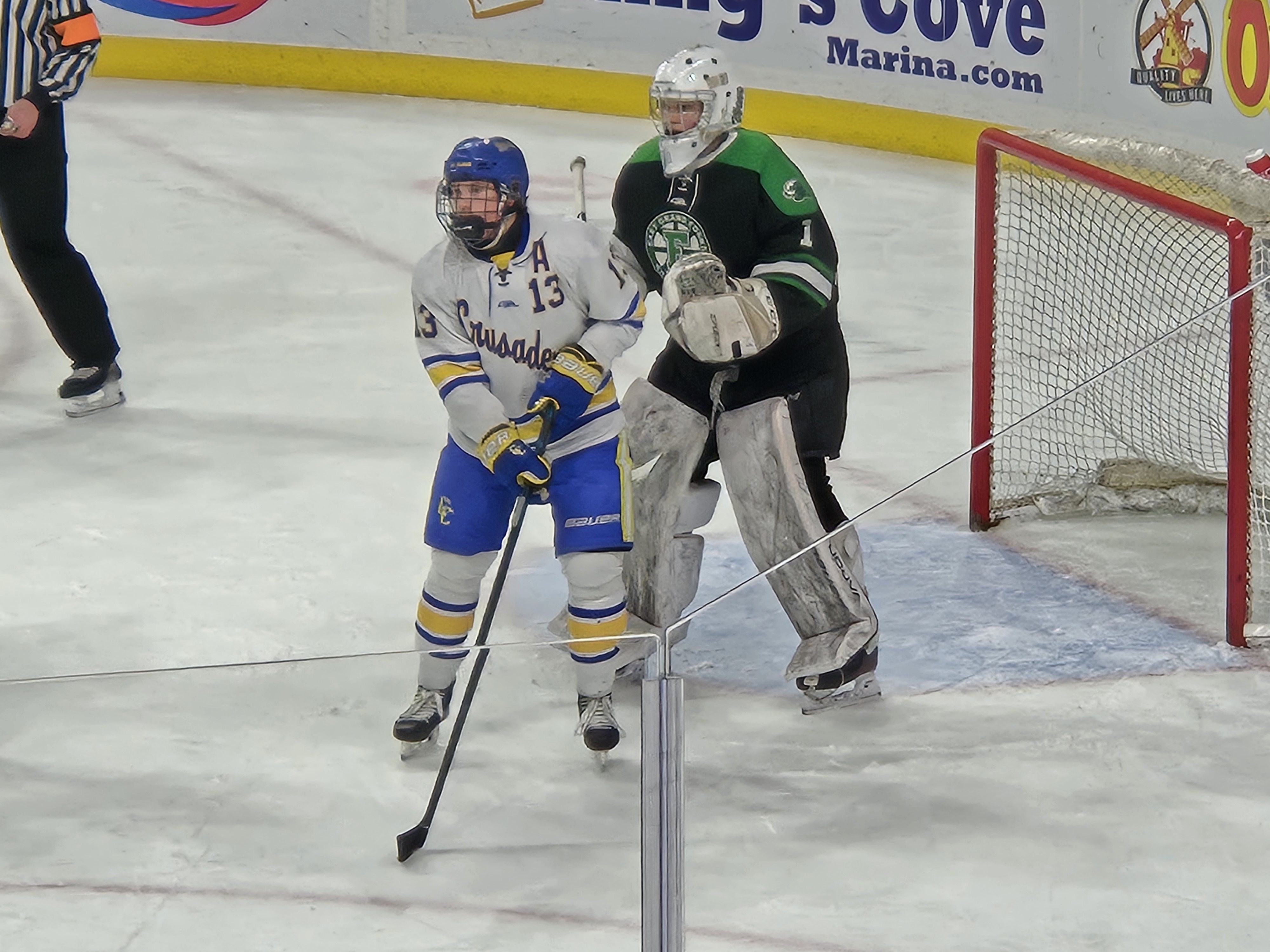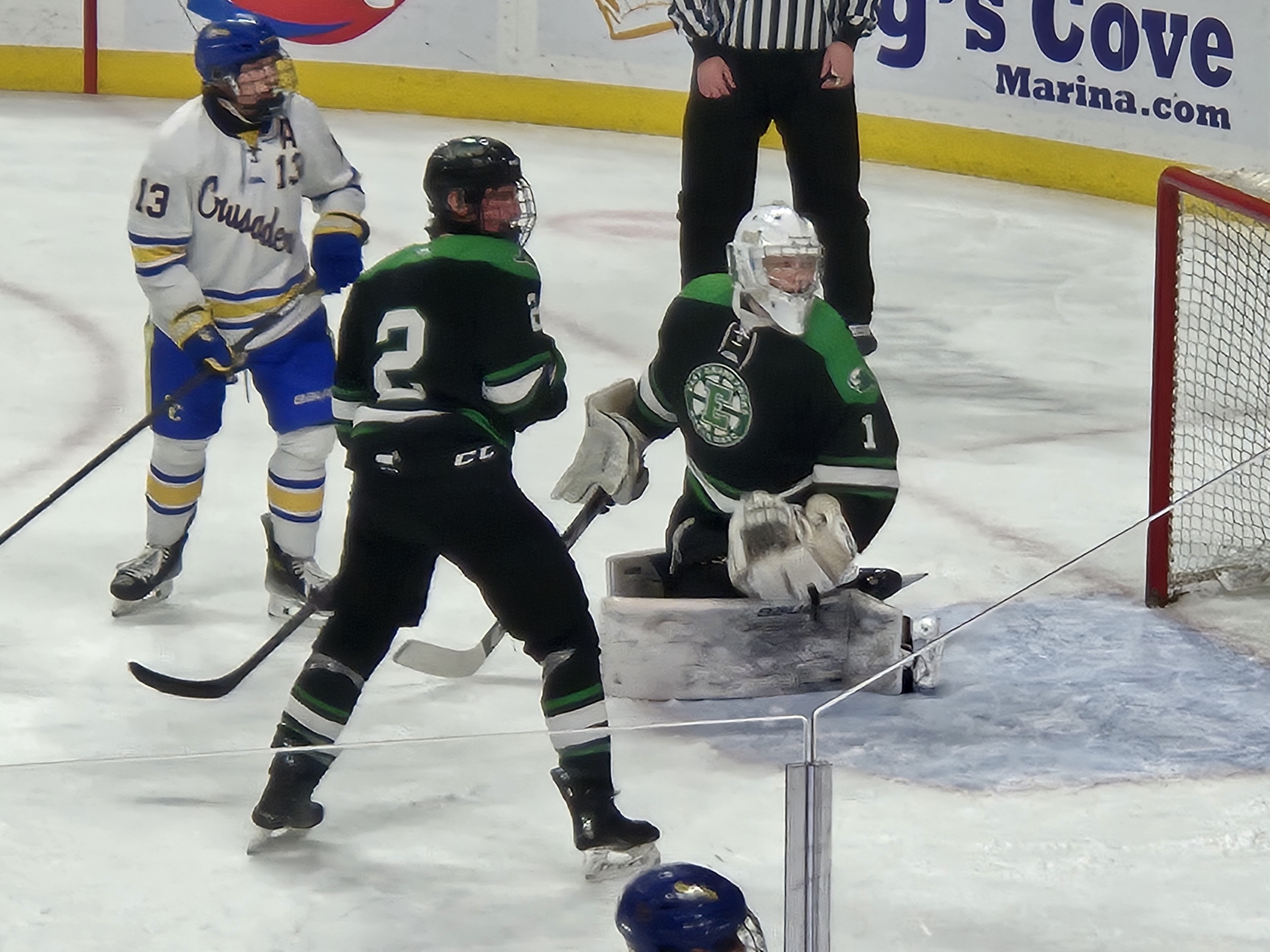 St. Cloud hit a cross bar just two minutes into the game and got off to an 8-1 edge in shots at one point during the period. East Grand Forks had several golden chances and nearly lit the lamp before Crusaders goalie Keaton LeGrande made a few stellar saves to keep the game scoreless through one frame.