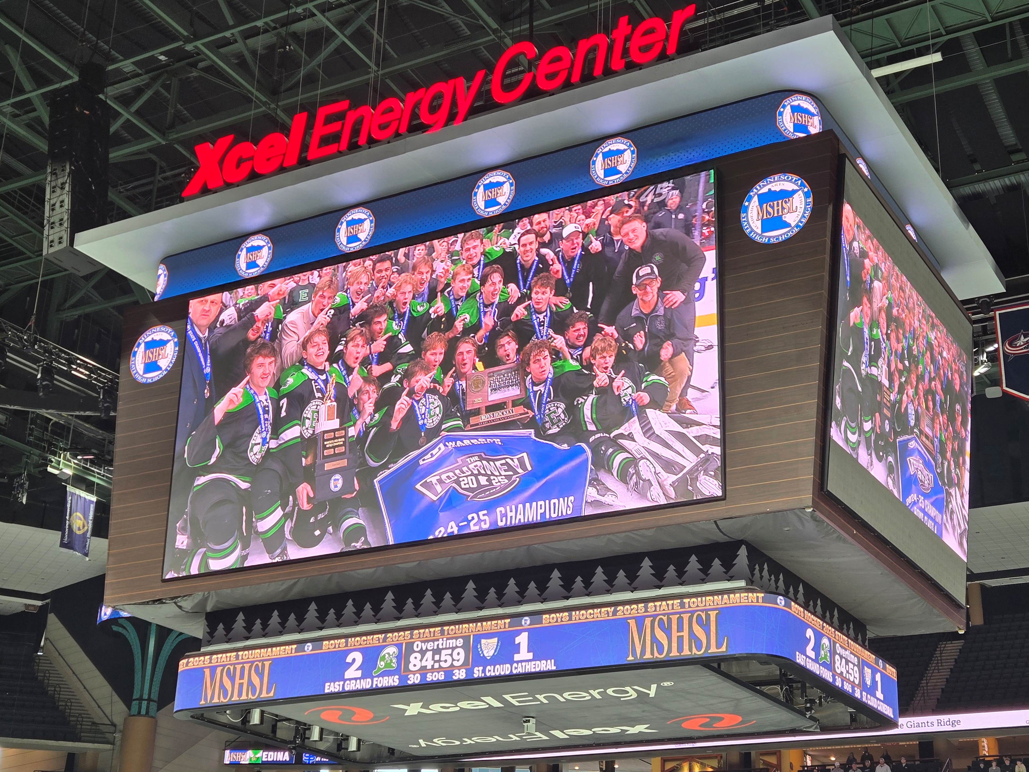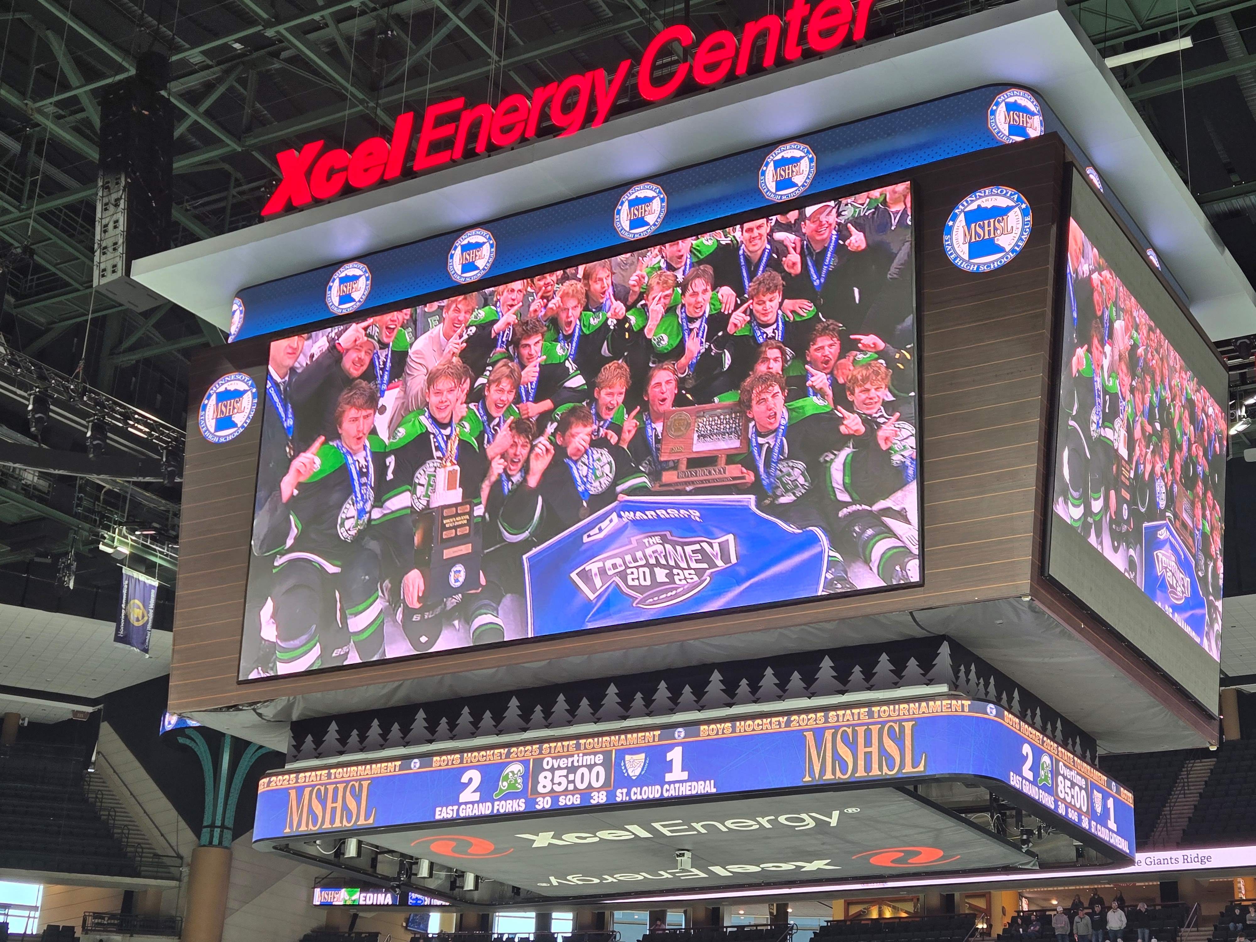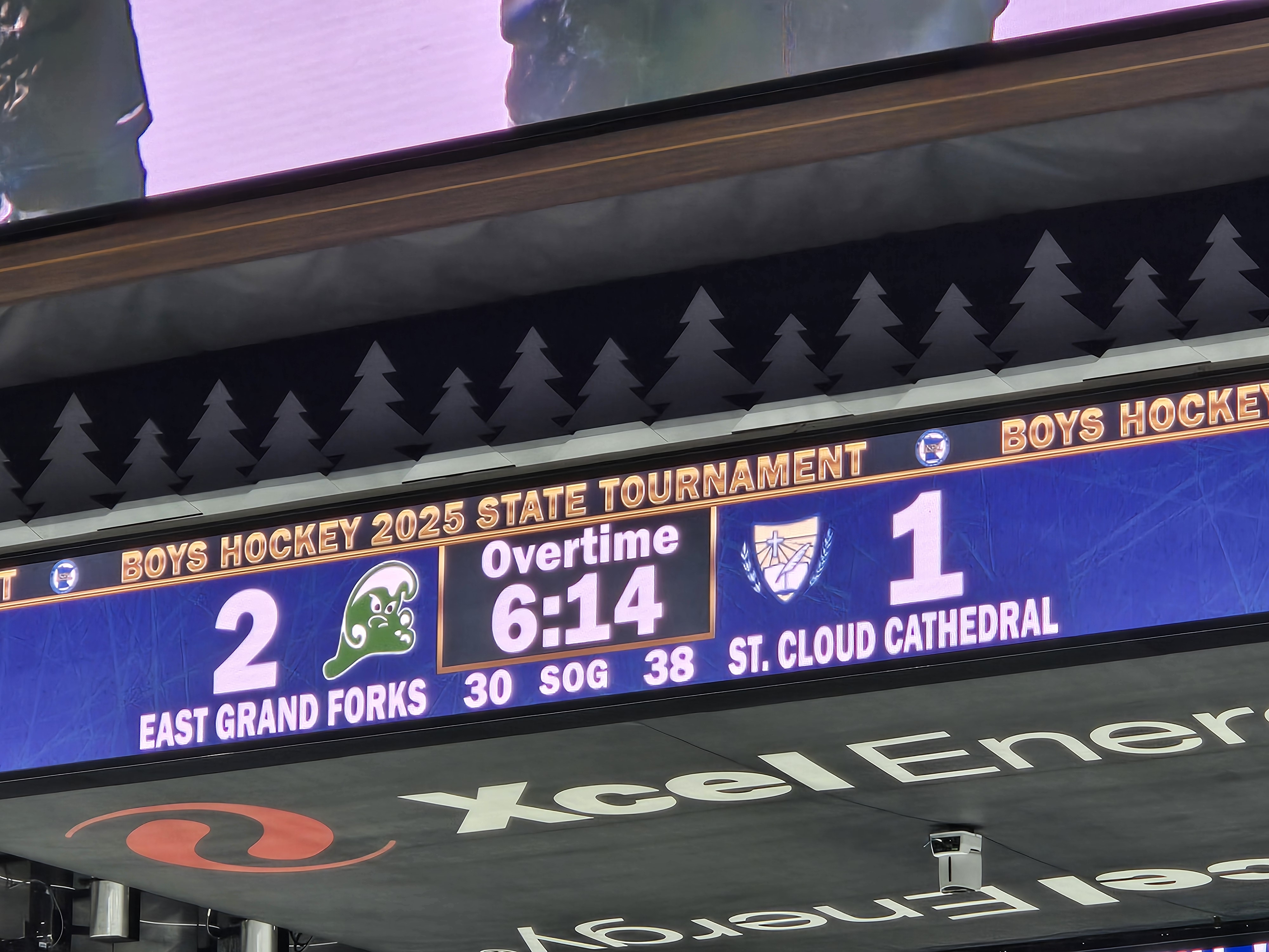 In the Class 1A Final, goaltender Noah Schindele saved 37 shots as No. 4 seed East Grand Forks (16-13-2) won 2-1 in overtime against No. 2 seed St. Cloud Cathedral Crusaders (20-9-2) for the victory, its their third in hockey program history.