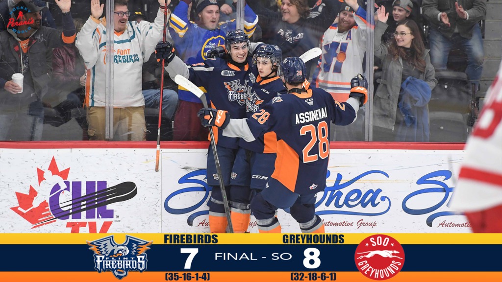 The game headed to overtime tied 7-7. The Greyhounds outshot Flint 13-12 in the third period for a 60-minute edge of 48-33. The Firebirds outdrew the Soo 36-30 through regulation. On the power play, Flint finished 3-of-5 and Sault Ste. Marie ended at 1-for-2. Neither team lit the lamp in the five-minute three-on-three overtime period, although the Birds outshot the Hounds 7-4.