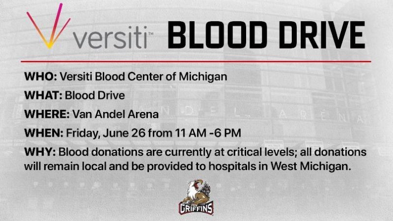 GRAND RAPIDS, Mich. – As the need for blood across the state continues to rapidly increase, the Grand Rapids Griffins and Versiti Blood Center of Michigan are teaming up to host a blood drive at Van Andel Arena on Friday, June 26 from 11 a.m. – 6 p.m.