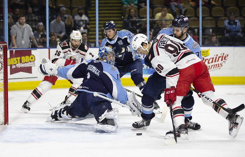 The Griffins nearly took a 3-0 lead with around eight minutes to play when Veleno broke out on a breakaway. Veleno’s point blank chance was saved by the netminder but the rebound was gathered by Chris Terry. Terry looked as though he would score his 18th goal of the season but his shot was somehow saved by a diving Grosenick to keep Milwaukee in the game.