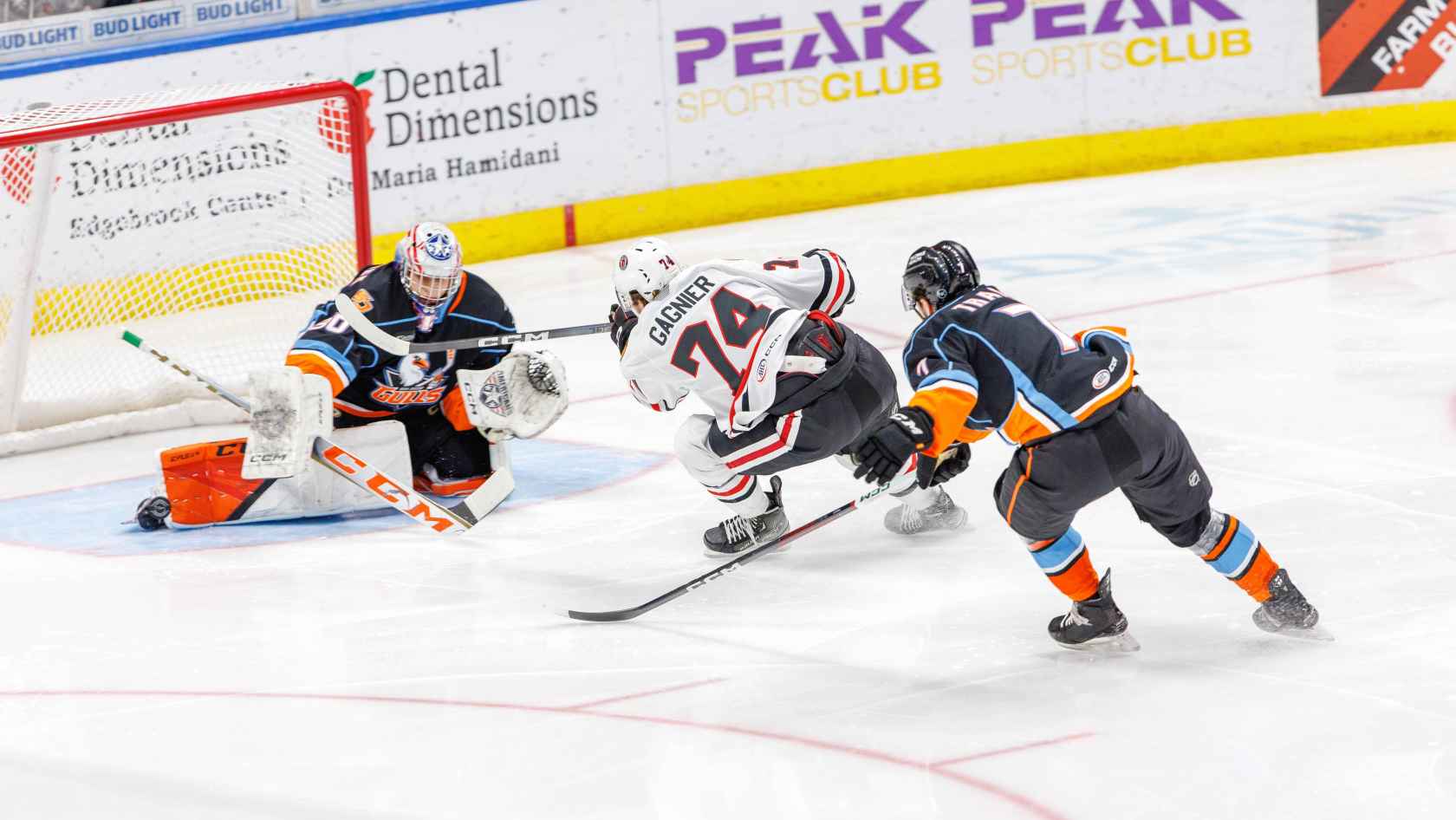 Agozzino scored again in the first period with a little over three minutes left in the first period, on a backhand pass from Jacob Perreault to the right side of the net to double the Gulls lead (16:47).