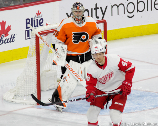 Detroit Red Wings #48 Alex Chiasson attempts to screen Goalie Carter Hart #79 of the Philadelphia Flyers