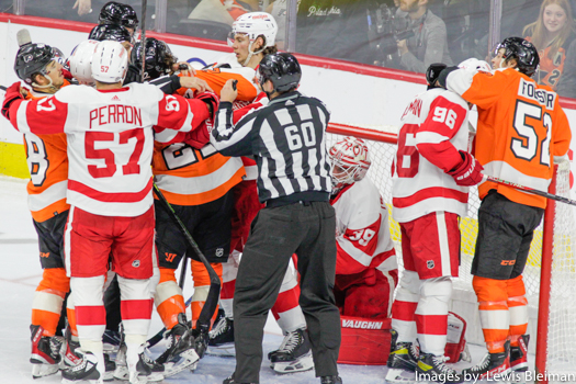 A scum around the net after the whistle blew between Philadelphia Flyers and Detroit Red Wings players