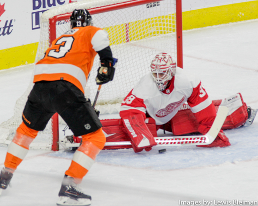 Goalie Alex Nedeljkovic #39 of the Detroit Red Wings blocks a shot by Kevin Hayes #13 of the Philadelphia Flyers