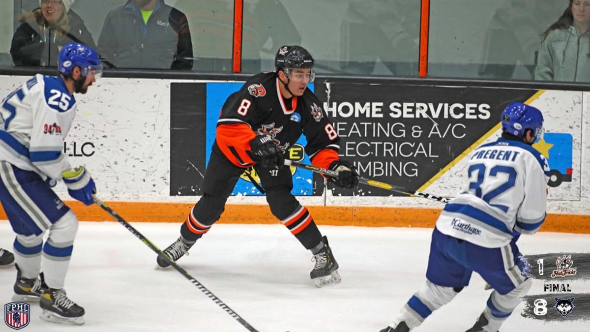 WATERTOWN, NY – The Danbury Hat Tricks (24-11-3, 71 pts) dropped the final game of a three-game series 8-1 to the Watertown Wolves (26-6-1, 77 pts) on Saturday.