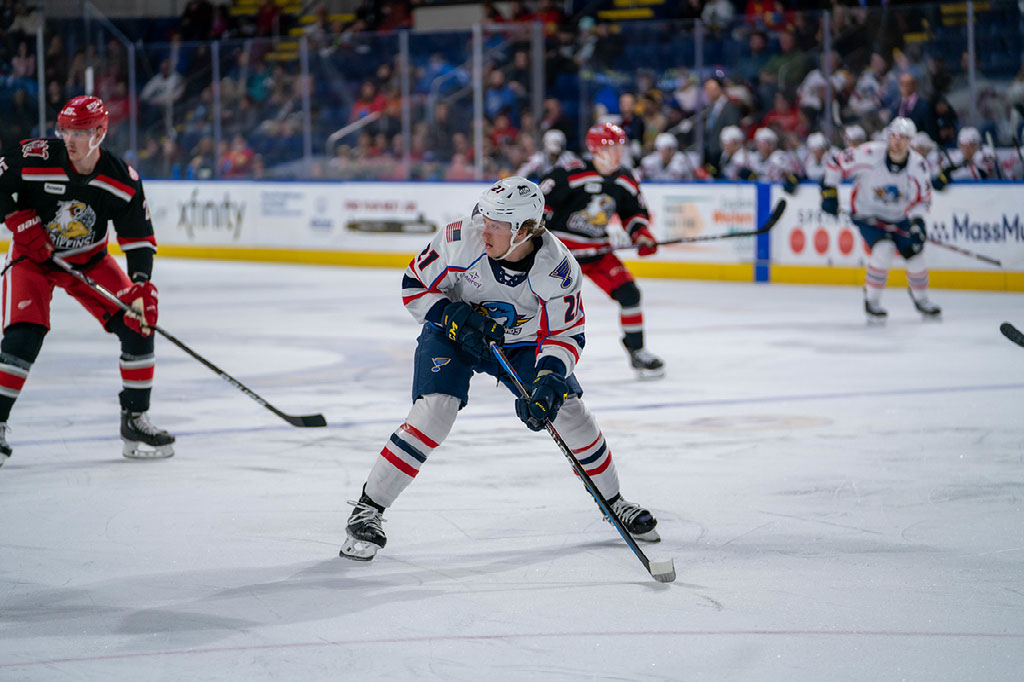 As has been the case for much of his second season in Springfield, Joel Hofer was stellar in the opening period, making 16 saves in the first 20 minutes. Several of those chances were high-danger ones, and Hofer came up with stone-cold denials on a Tyler Spezia breakaway, as well as a pair of masterful saves moving post-to-post against Alex Chiasson and Gordie Green.