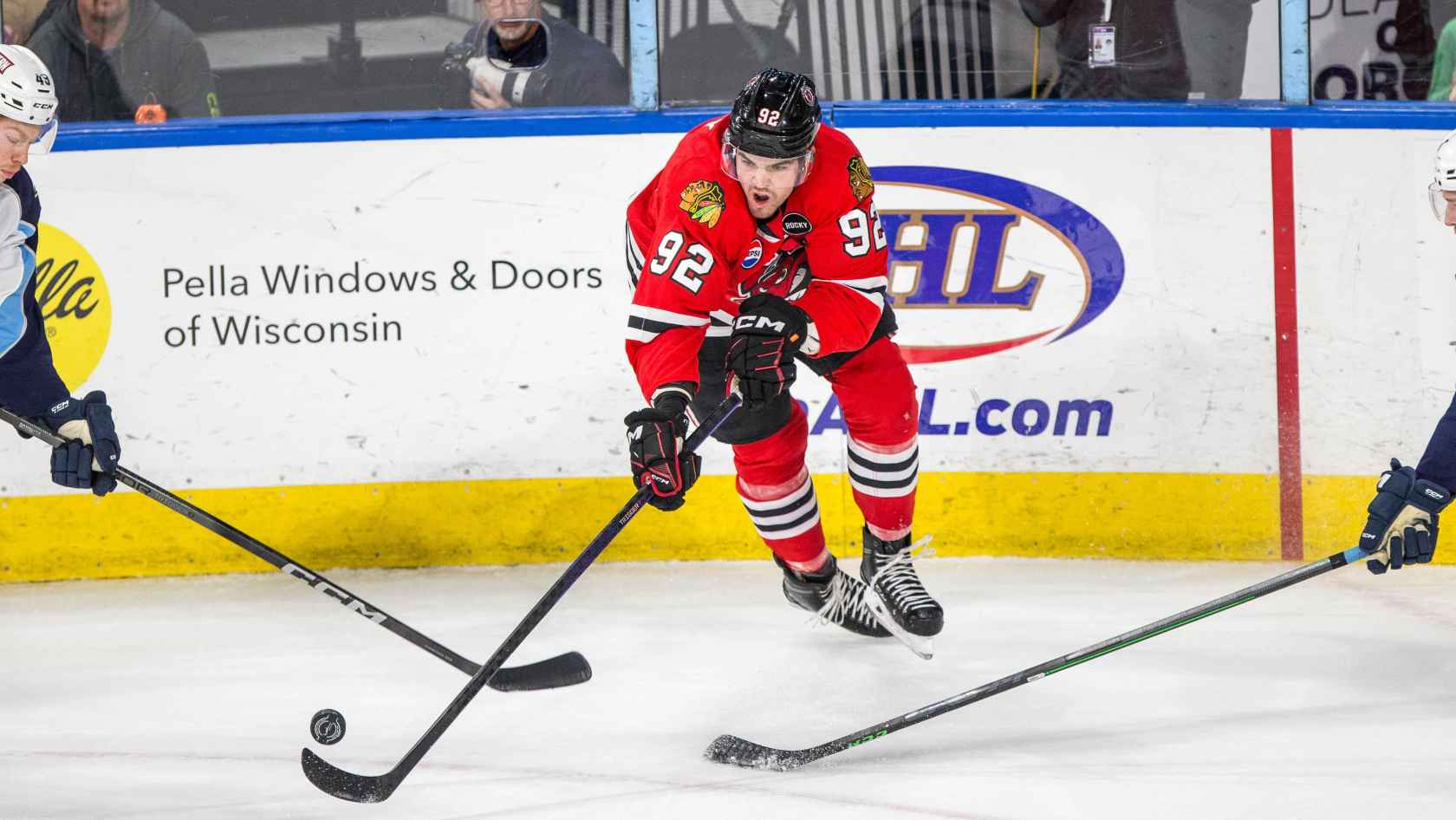 Shortly after the halfway point in the first period, Teply gave the IceHogs a 1-0 lead with a wrister from the slot. As Jalen Luypen intentionally let a centering pass from Ryder Rolston on the right wing go between his skates, Teply buried the puck past the glove side of Grosenick (10:35).