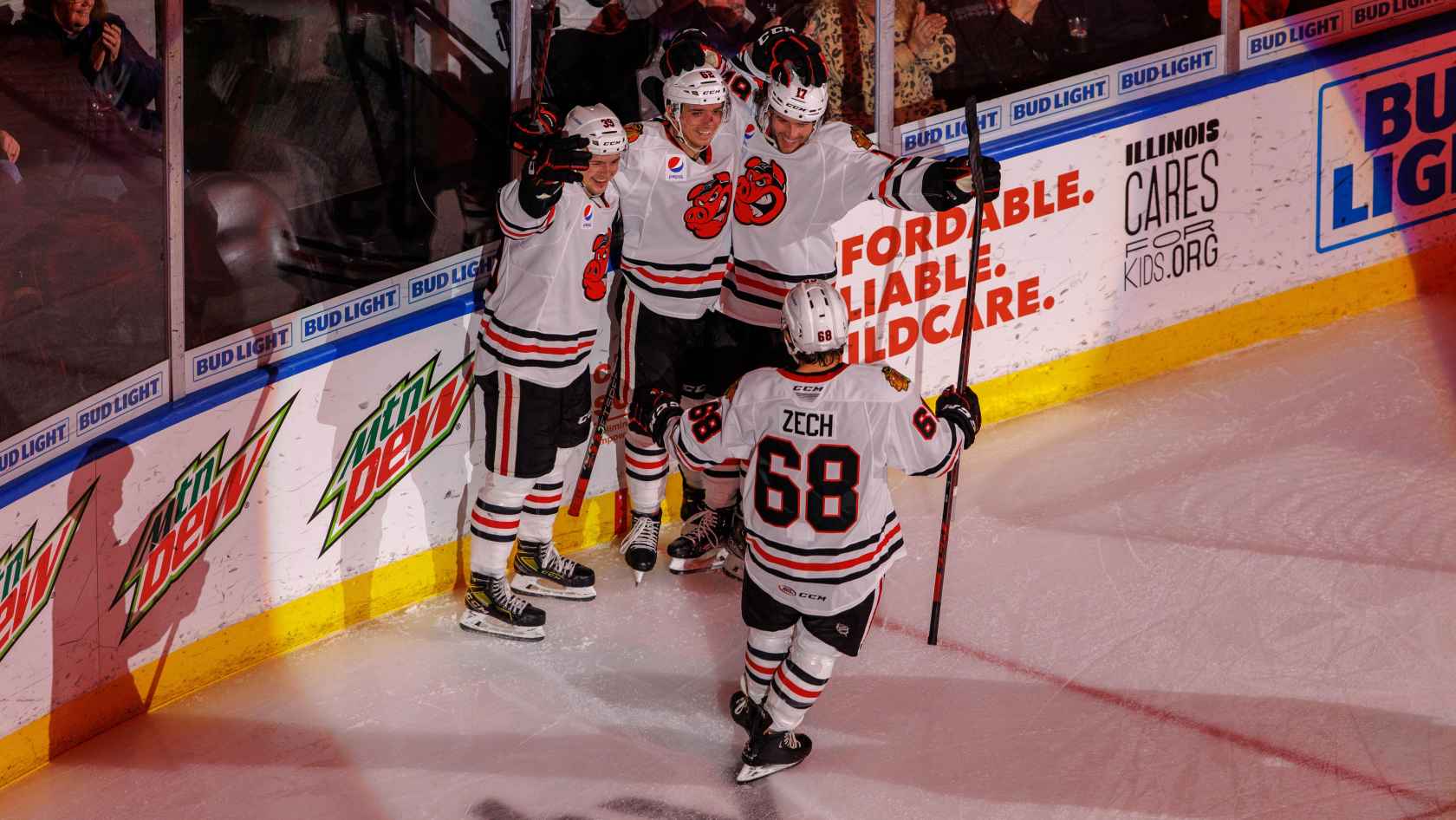 After fending off the Wolves’ power play that carried over from the first period, the IceHogs came out swinging in the middle frame with four unanswered goals. Defenseman Cooper Zech struck first for the Hogs after launching a shot from just in front of Chicago’s blue line at 5:06, scoring his first goal of the season to tie the contest 1-1.