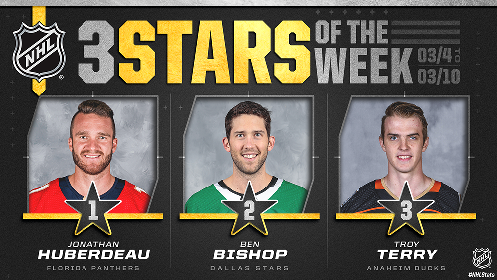NEW YORK – Florida Panthers left wing Jonathan Huberdeau, Dallas Stars goaltender Ben Bishop and Anaheim Ducks right wing Troy Terry have been named the NHL’s “Three Stars” for the week ending March 10.