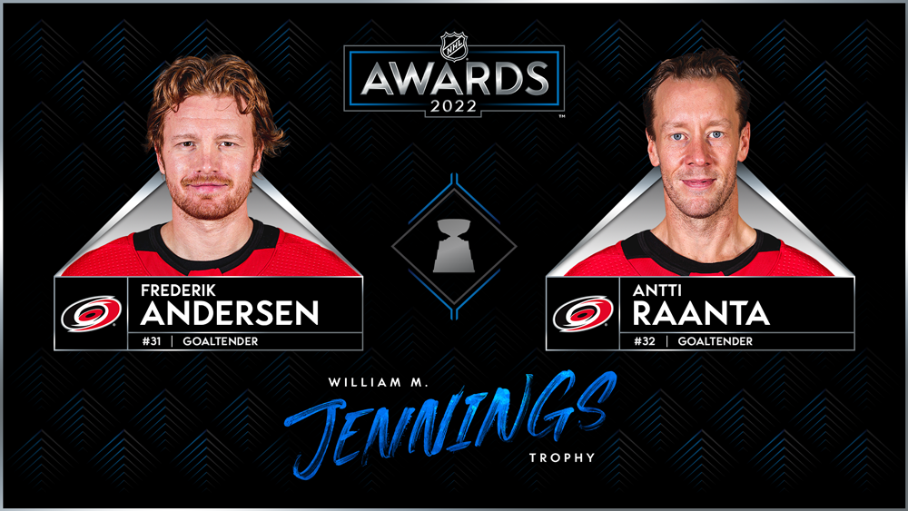 NEW YORK – The Carolina Hurricanes tandem of Frederik Andersen and Antti Raanta have won the 2021-22 William M. Jennings Trophy, presented annually to the goaltenders who play a minimum of 25 games for the team allowing the fewest goals during the regular season.