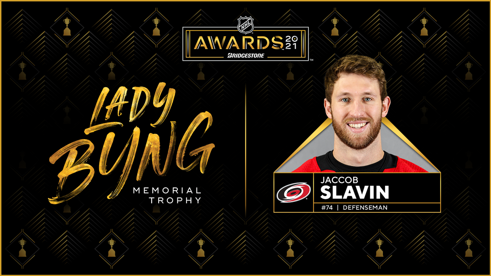NEW YORK – Carolina Hurricanes defenseman Jaccob Slavin is the 2020-21 recipient of the Lady Byng Memorial Trophy, awarded “to the player adjudged to have exhibited the best type of sportsmanship and gentlemanly conduct combined with a high standard of playing ability,” as selected by the Professional Hockey Writers Association.