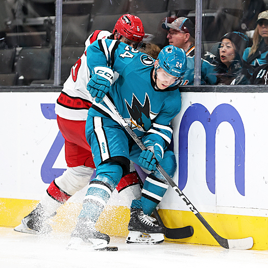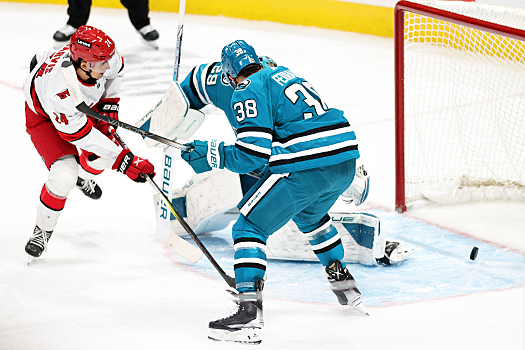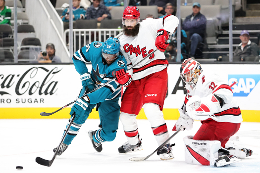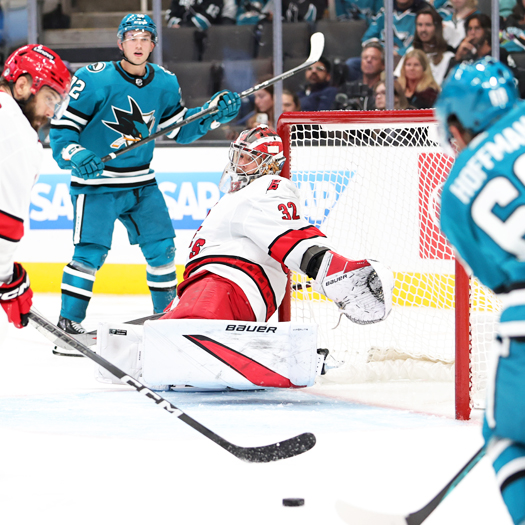 William Eklund made it 3-2 at 16:06 when he scored on his own rebound on a Sharks power play. Carolina unsuccessfully challenged for goaltender interference.