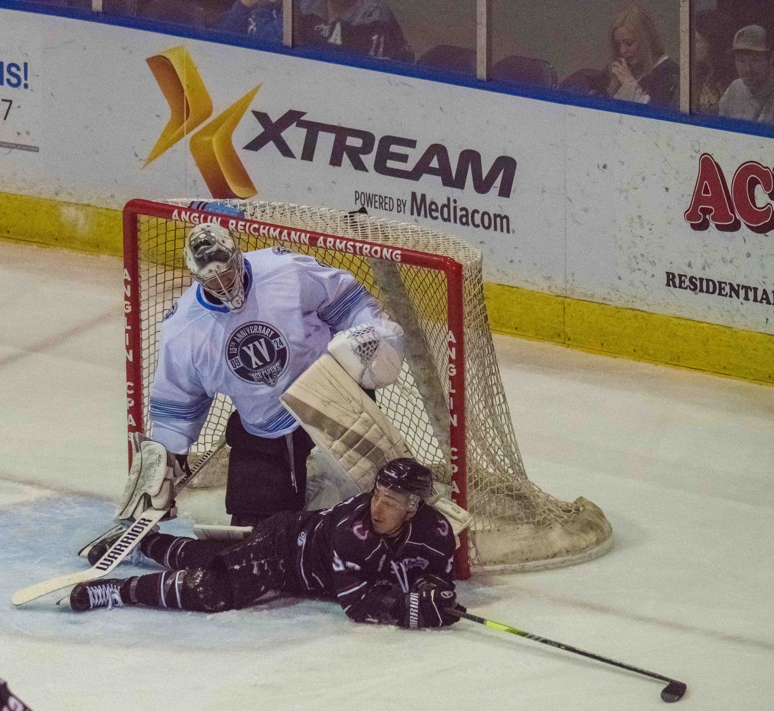 The game’s only goal came on what started as a pass. Birmingham’s Dillon Radin was created for a goal when his play in the goal crease area led to the puck bouncing off a skate and into the net.