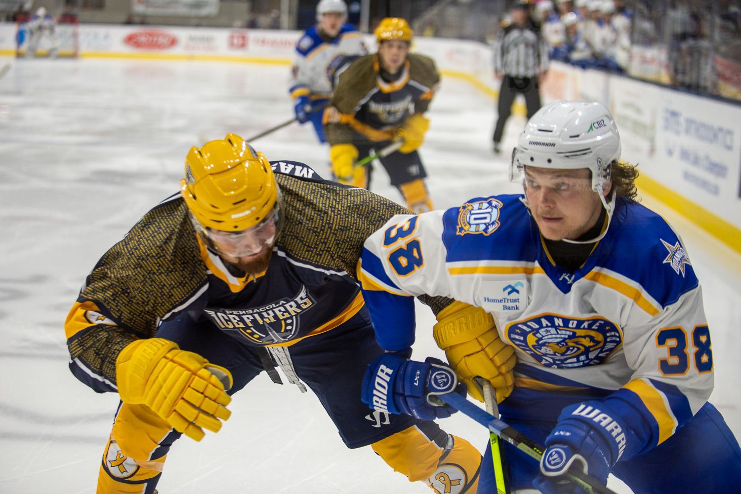 PENSACOLA, FLA. – The Ice Flyers hosted Rally Foundation Night presented by Florida Blue at the Hangar, and delivered an exciting performance for the fans. The Roanoke Rail Yard Dawgs scored early with a powerplay goal close to the halfway mark of the first period. That was the only goal of the opening frame, but the Ice Flyers didn’t falter.