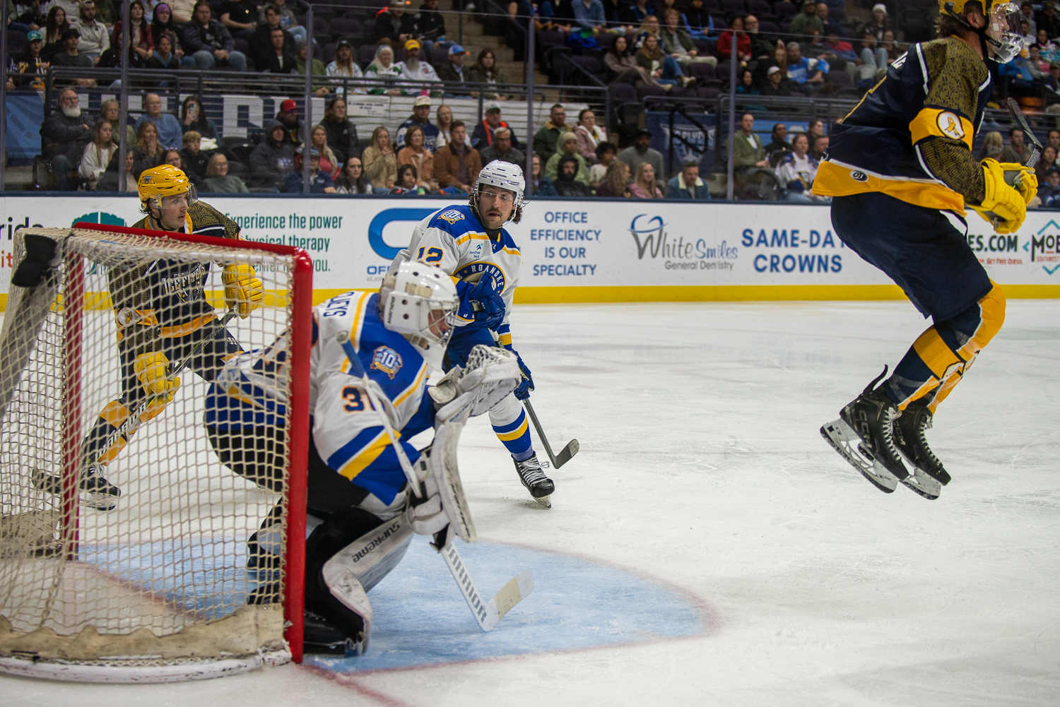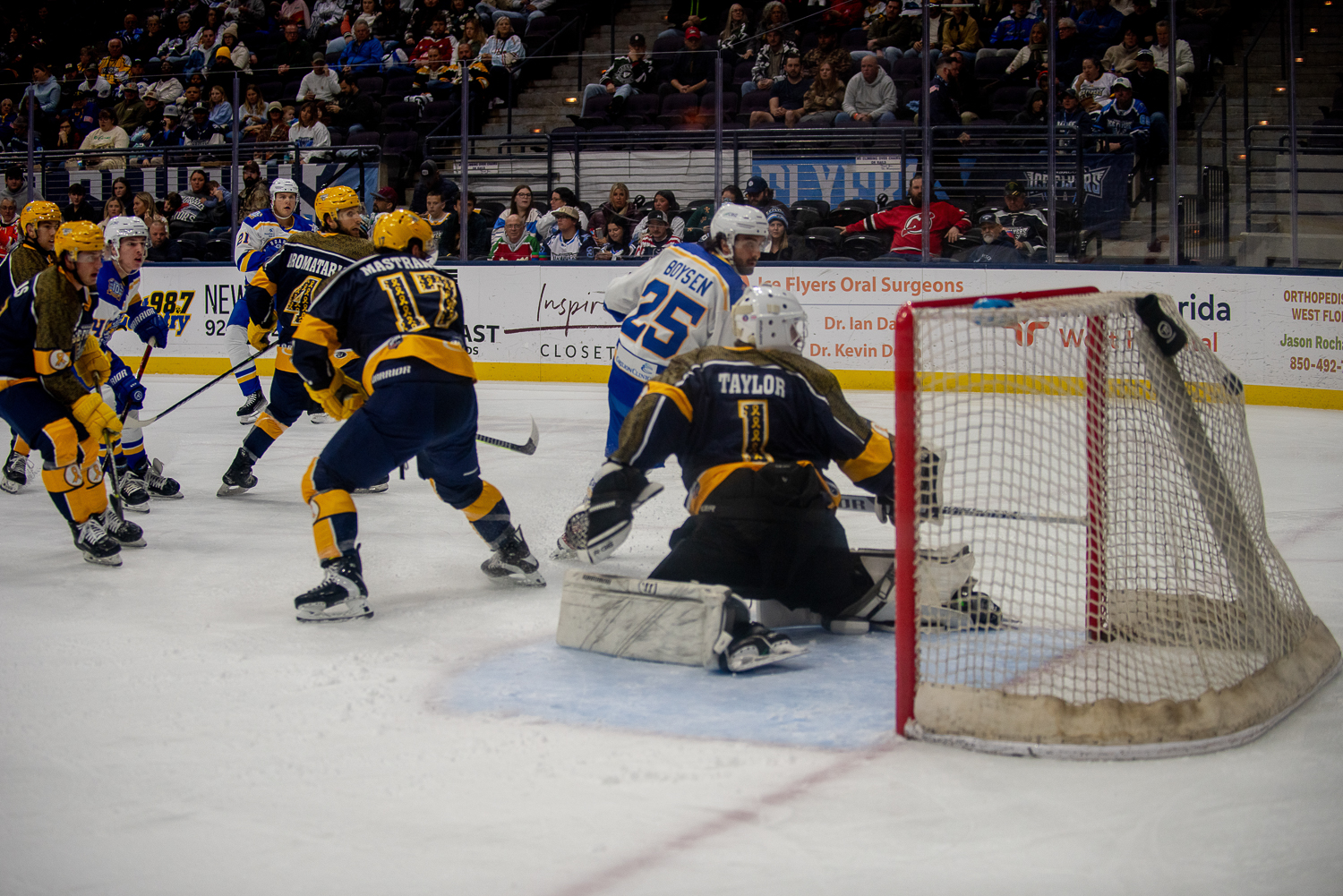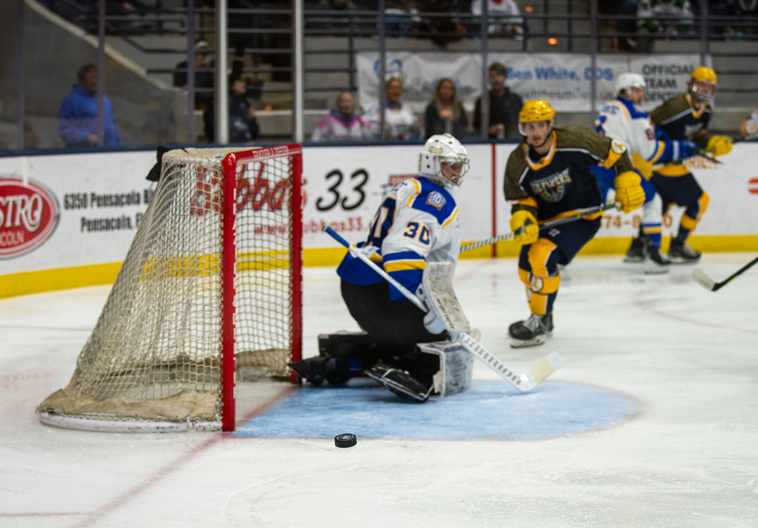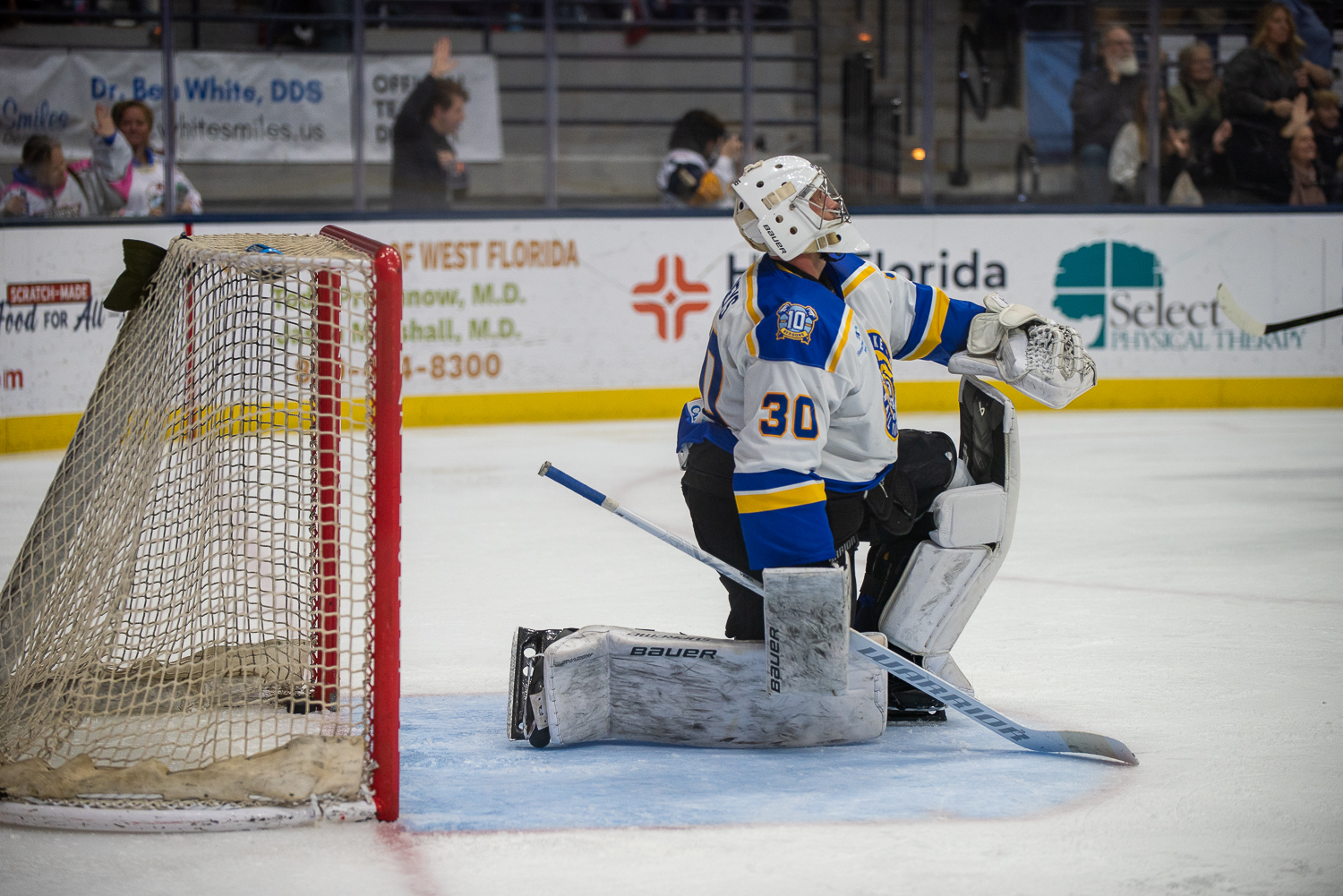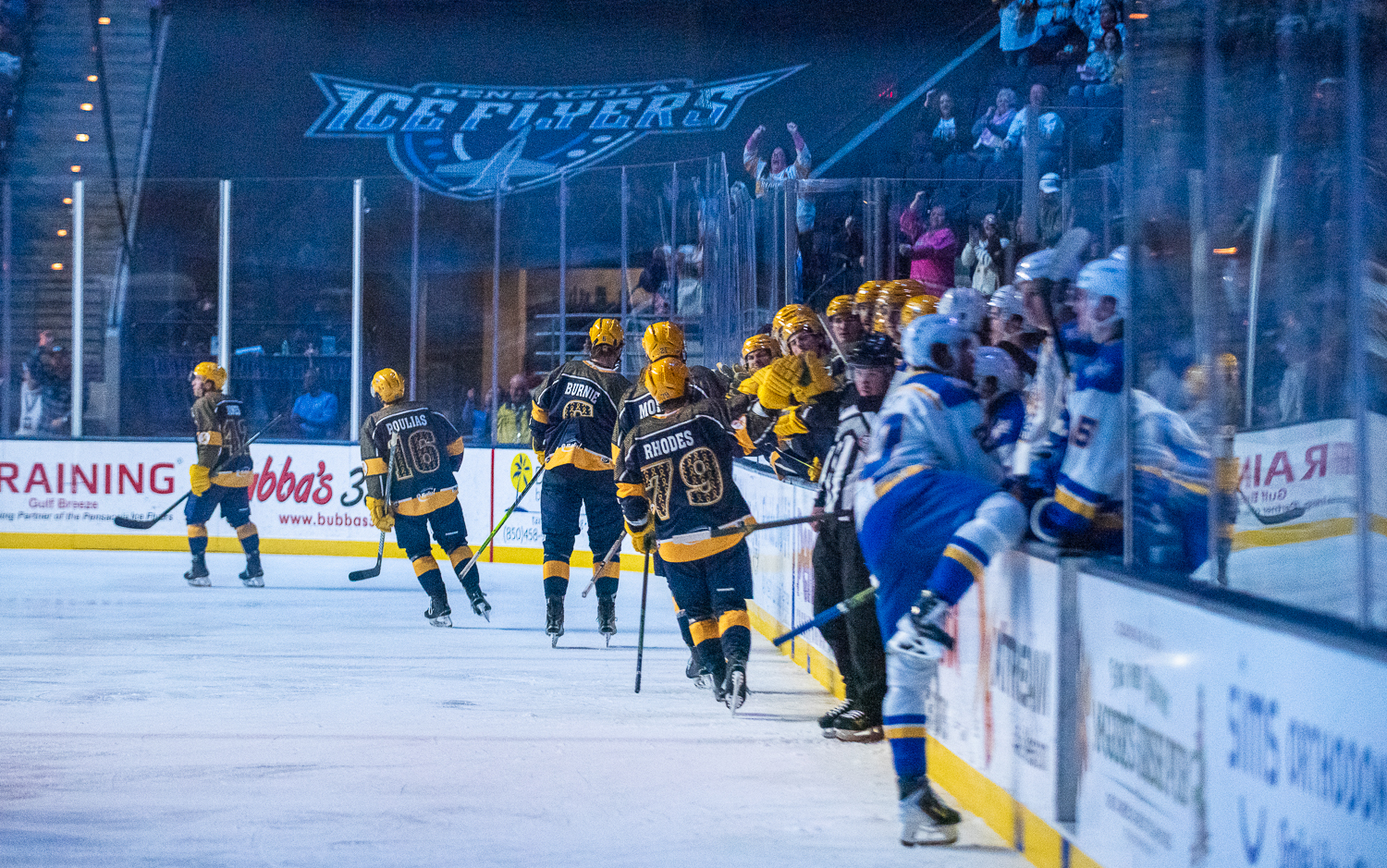 PENSACOLA, FLA. – The Ice Flyers hosted Rally Foundation Night presented by Florida Blue at the Hangar, and delivered an exciting performance for the fans. The Roanoke Rail Yard Dawgs scored early with a powerplay goal close to the halfway mark of the first period. That was the only goal of the opening frame, but the Ice Flyers didn’t falter.