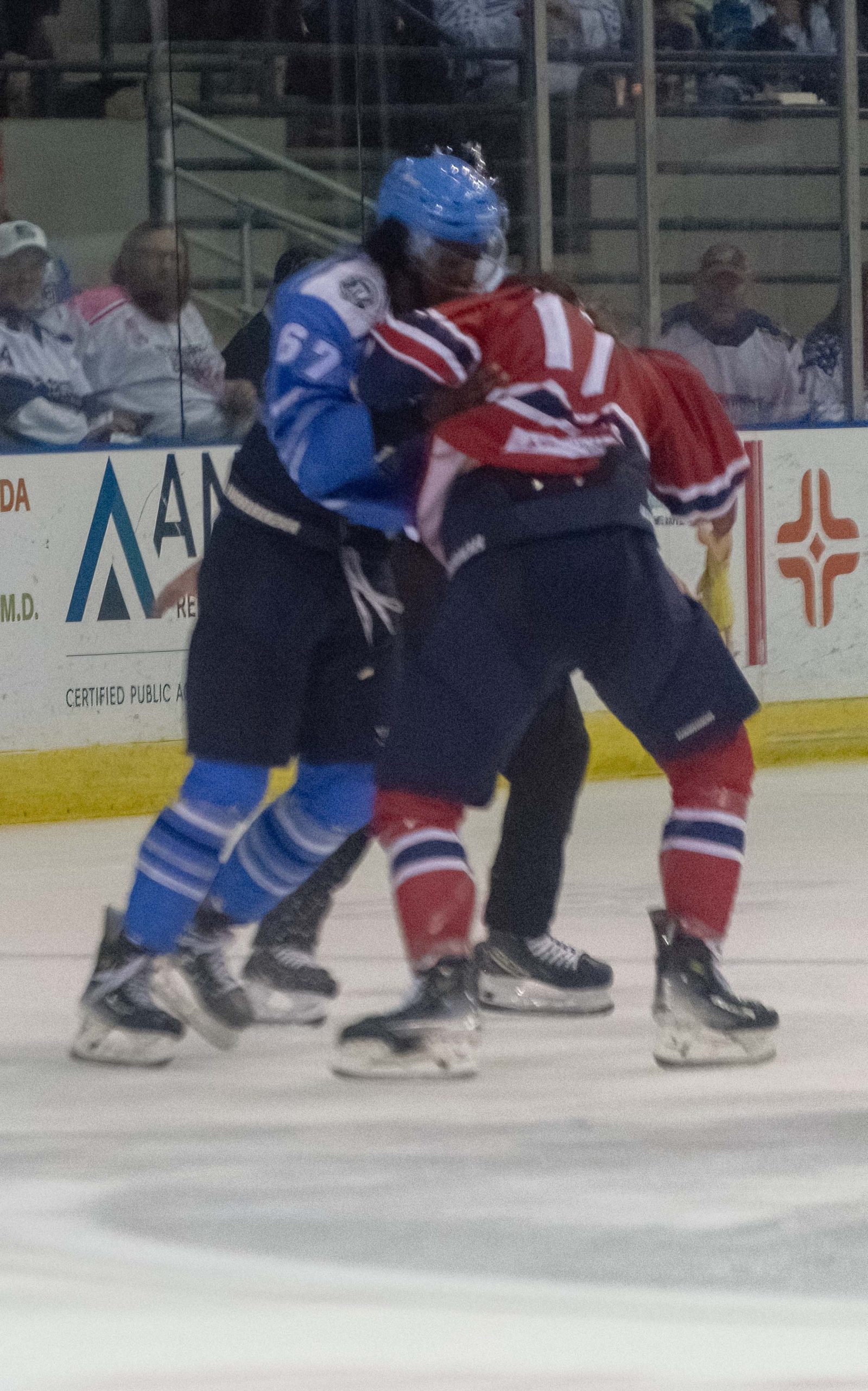 Less than a minute later, the Ice Flyers’ Malik Johnson brawled with Evansville’s Hobbs after both players squared off during play. Both landed several punches, Johnson wrestled Hobbs to the ice, then got up and exhorted the crowd as he circled to the penalty box.
