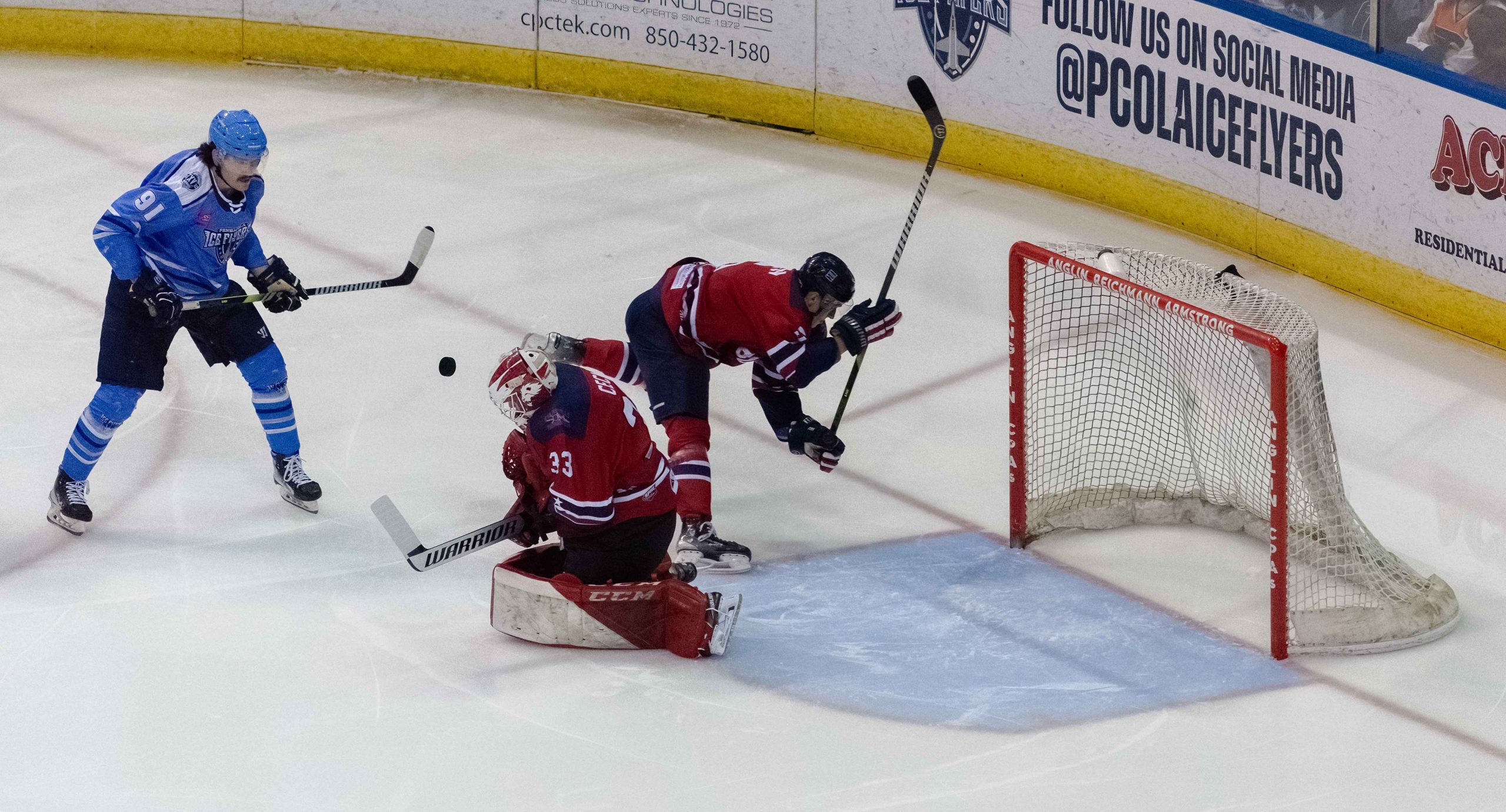 Ice Flyers goaltender Stephen Mundinger made five saves in the sequence, and the Ice Flyers won a key faceoff in the final 35 seconds and were able to finish off the win.