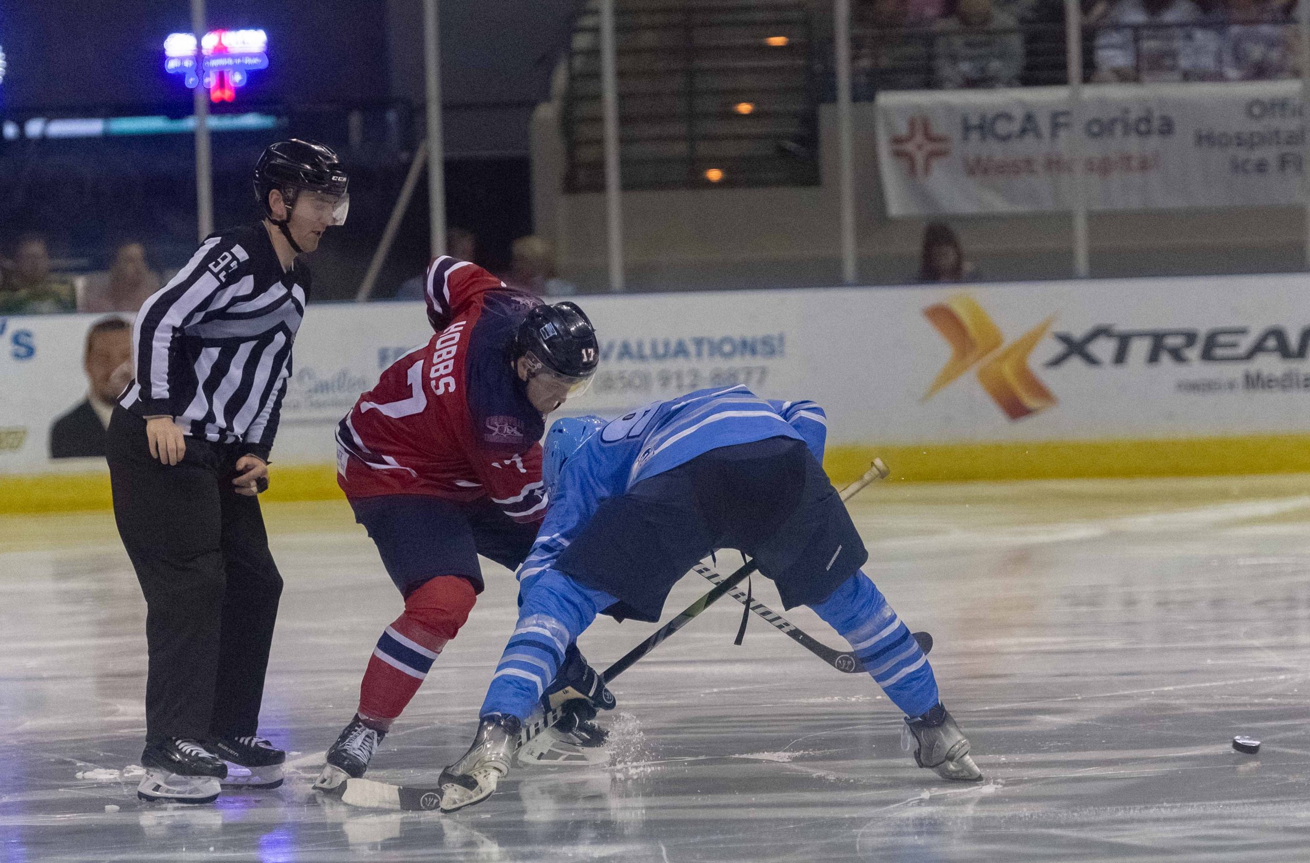 — Christopher Otto, executive officer of Naval Air Station-Whiting Field performed a ceremonial puck drop with members of his family. He was preceded by an executive from Navy Federal.