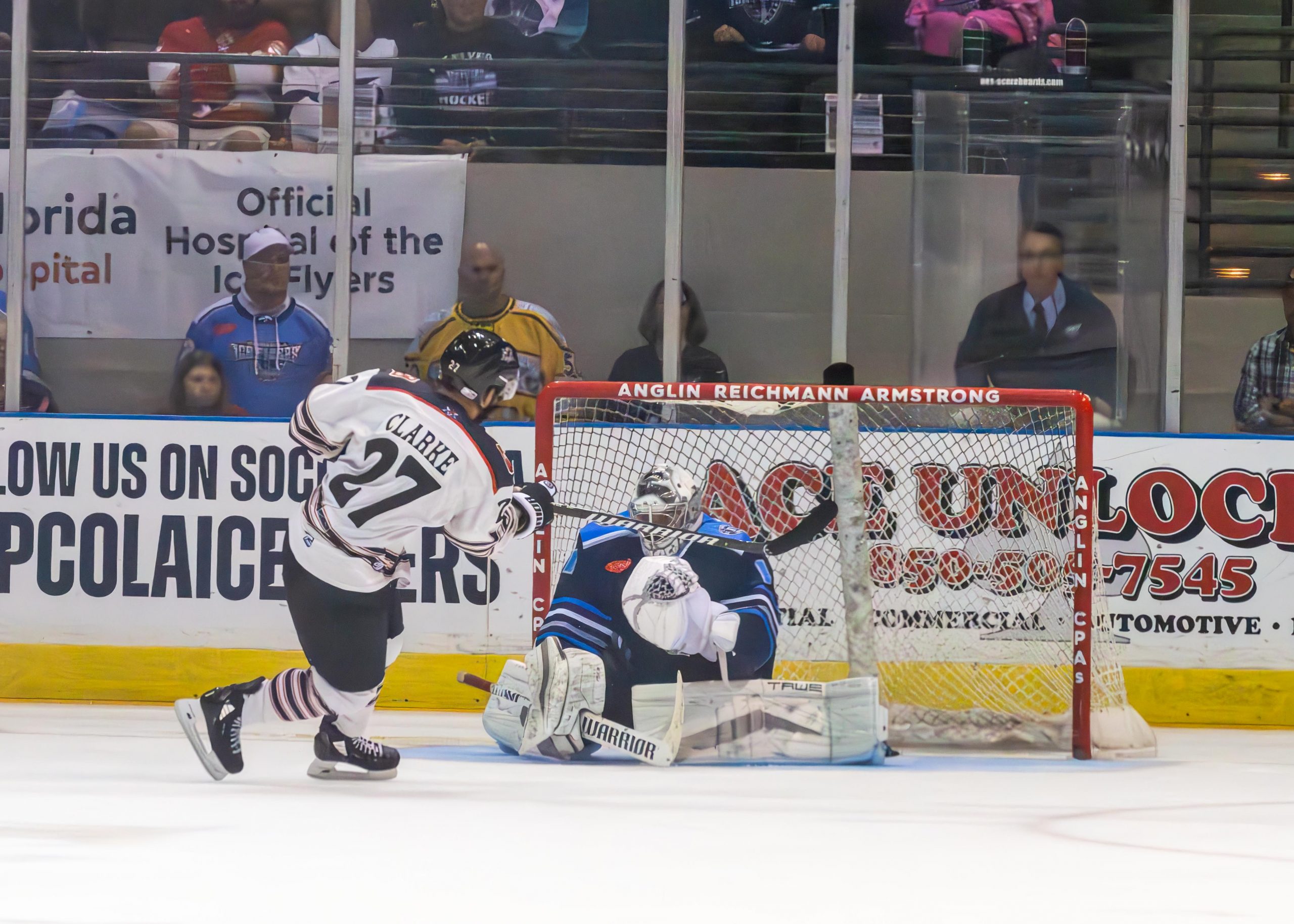 The Ice Flyers Brett Mecrones, who made his pro debut a week earlier in the Ice Flyers’ season-opening win, was the only goal-scorer in the shooter. He got a wrist shot past Huntsville’s Brian Wilson before all the drama ensued.
