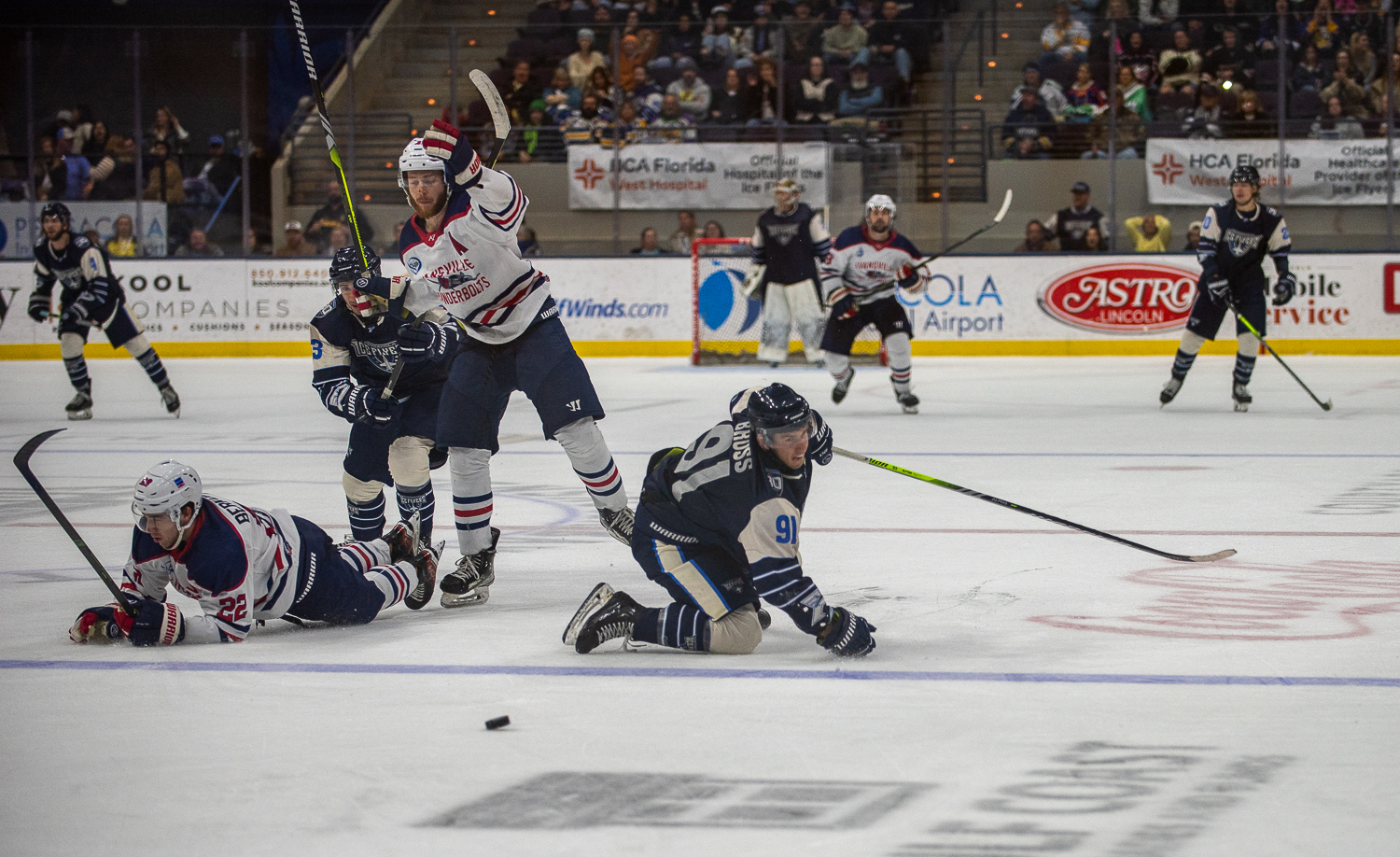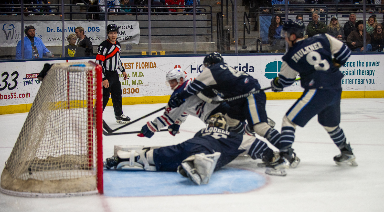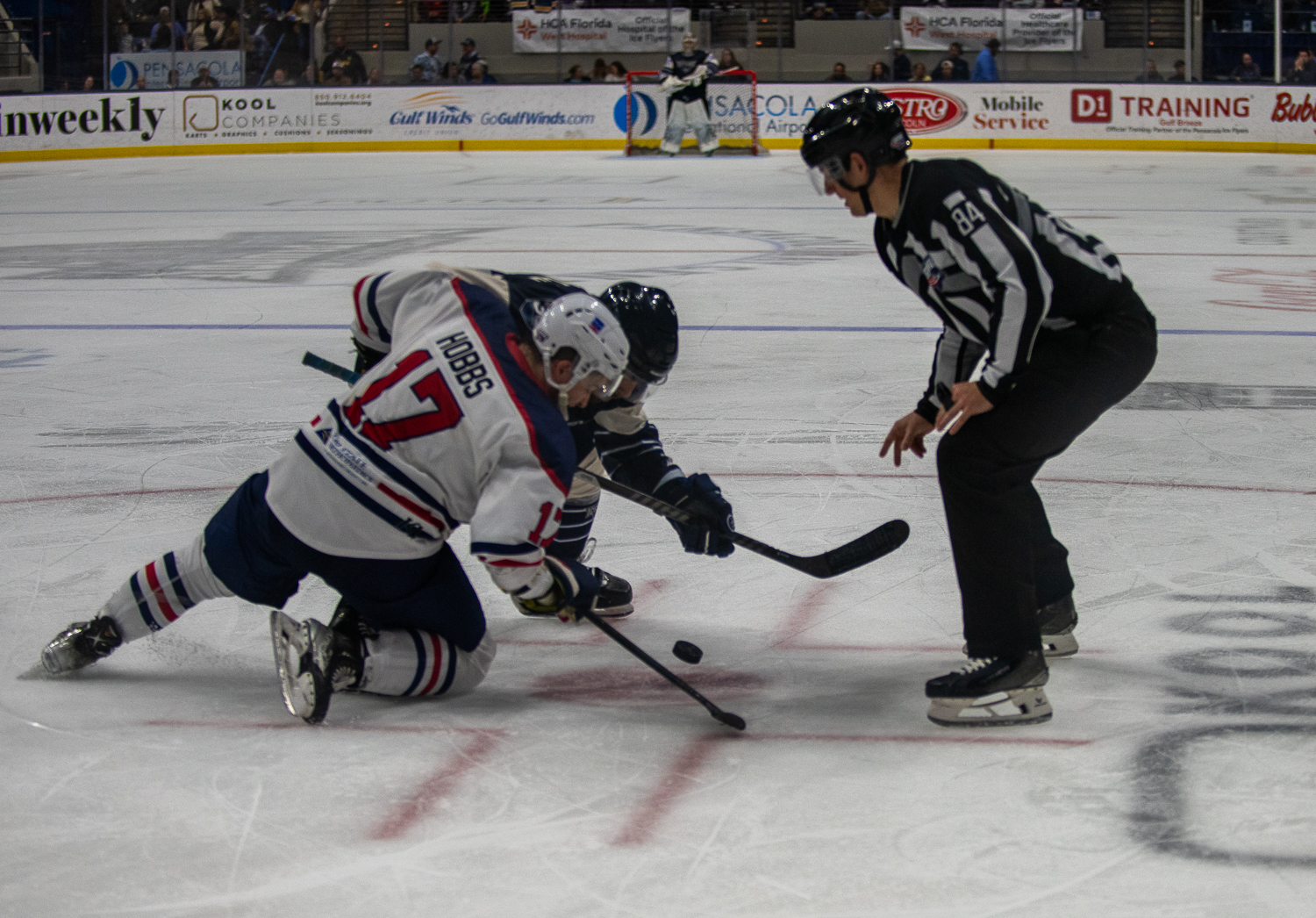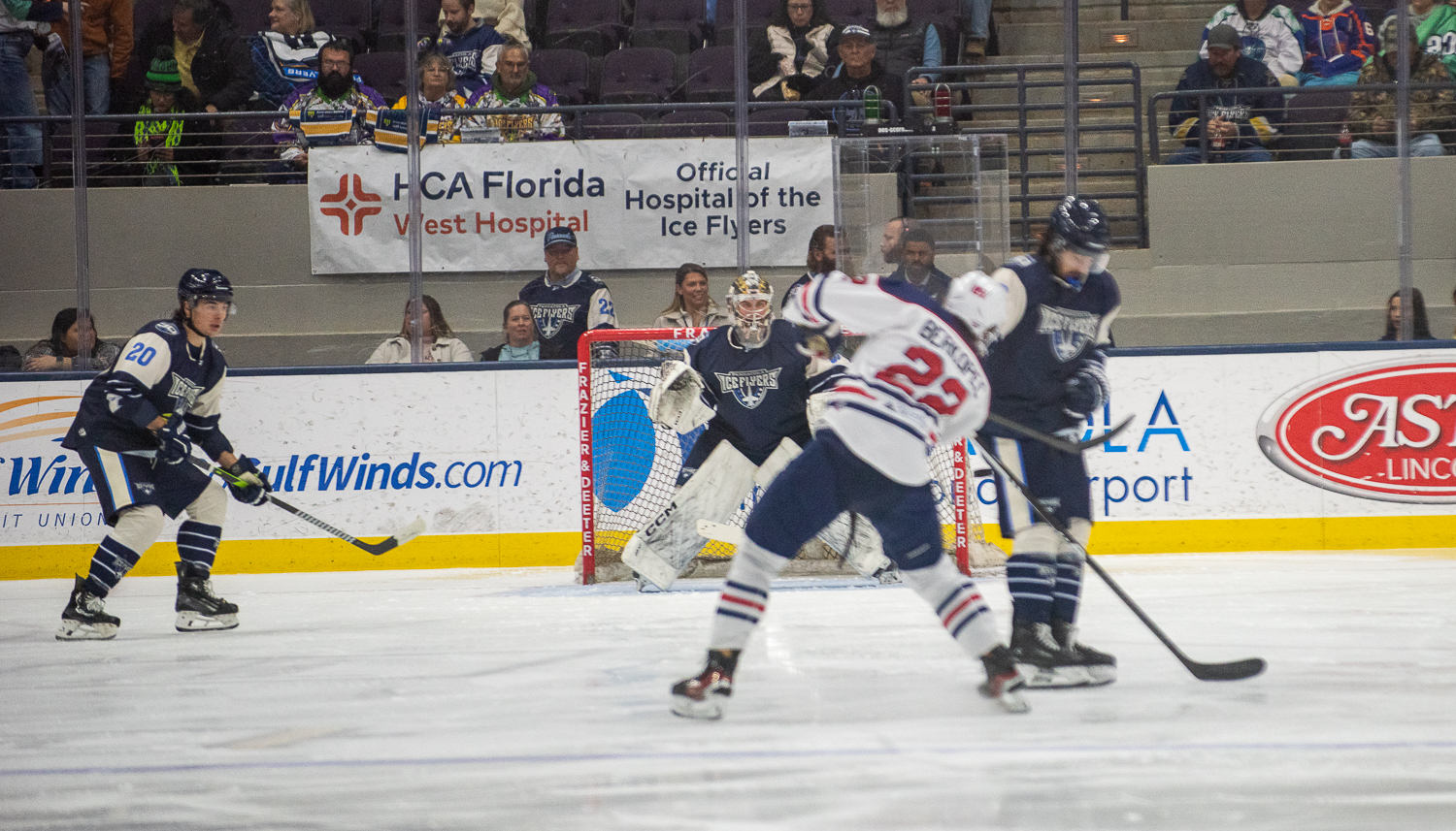 PENSACOLA, FLA. – A sellout crowd of 8,082 fans packed the Hangar on Saturday evening for Wiener Dog Race Night presented by PenAir Credit Union, marking the Ice Flyers’ fourth sellout of the season as they took on the reigning league champions, the Evansville Thunderbolts.