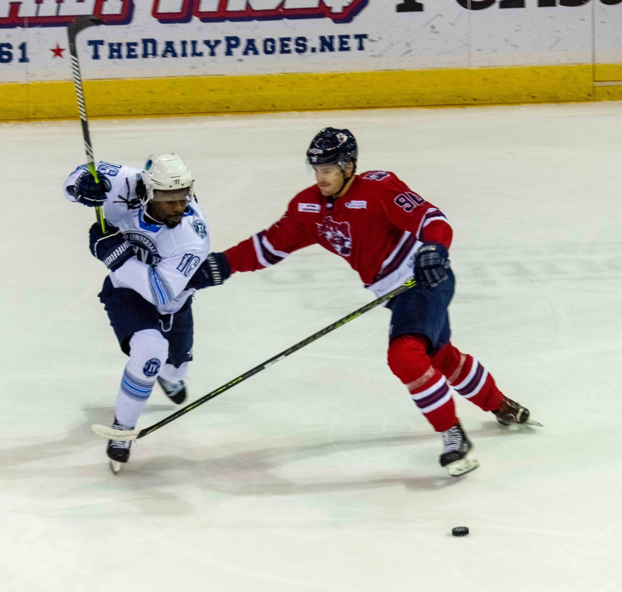 He won a race to the puck on a breakaway against Macon’s diving goaltender who was well out of the crease. Johnson then gained control and with a trailing defender easily tapped the puck into the net for a 3-1 lead.