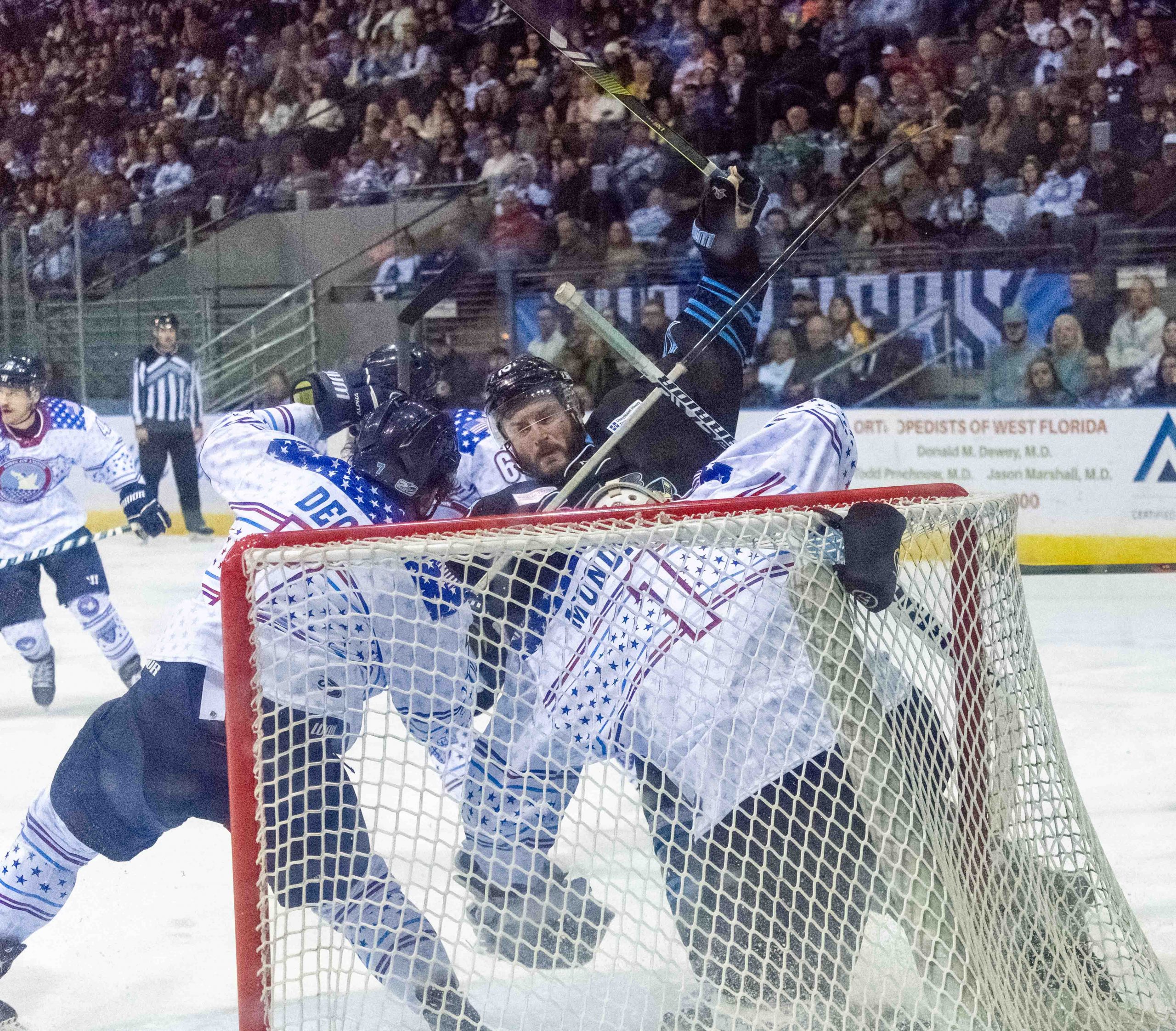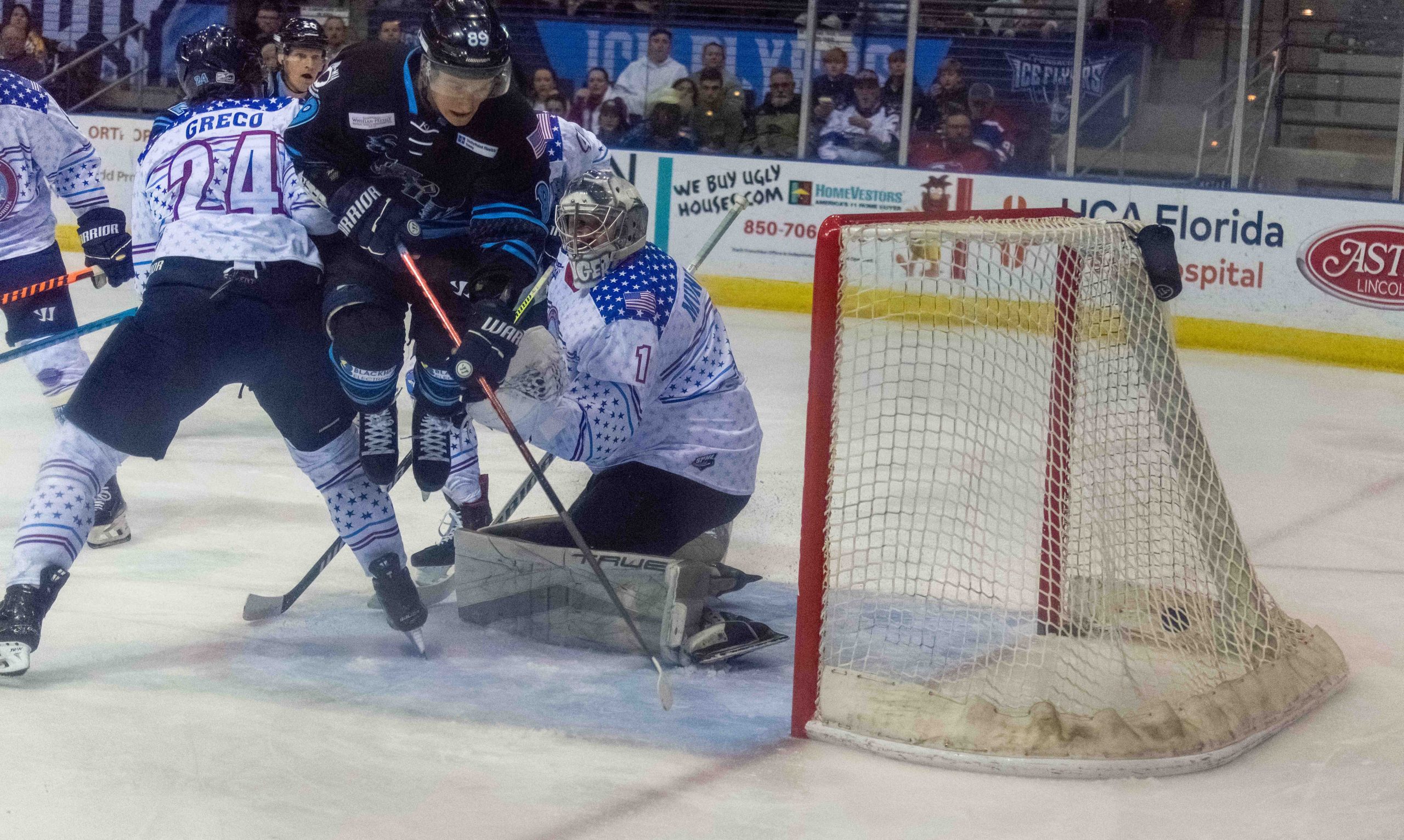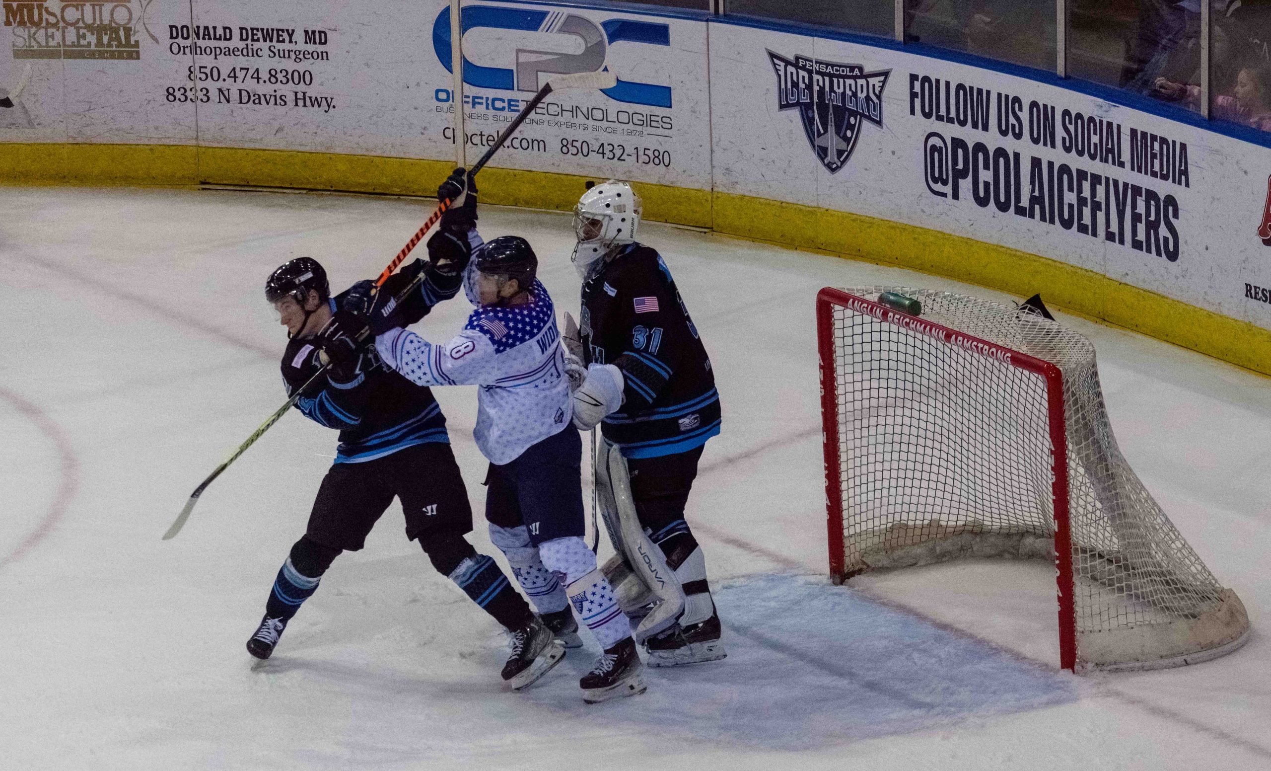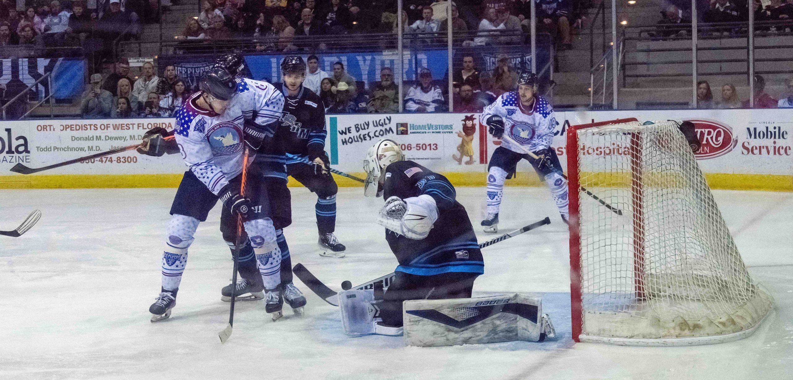 Trailing 3-0 into the third period, despite a huge advantage in shots on goal, the Ice Flyers’ comeback fell short in a 3-2 loss, amid the latest massive crowd of 7,019 at the Pensacola Bay Center for Military Appreciation Night.