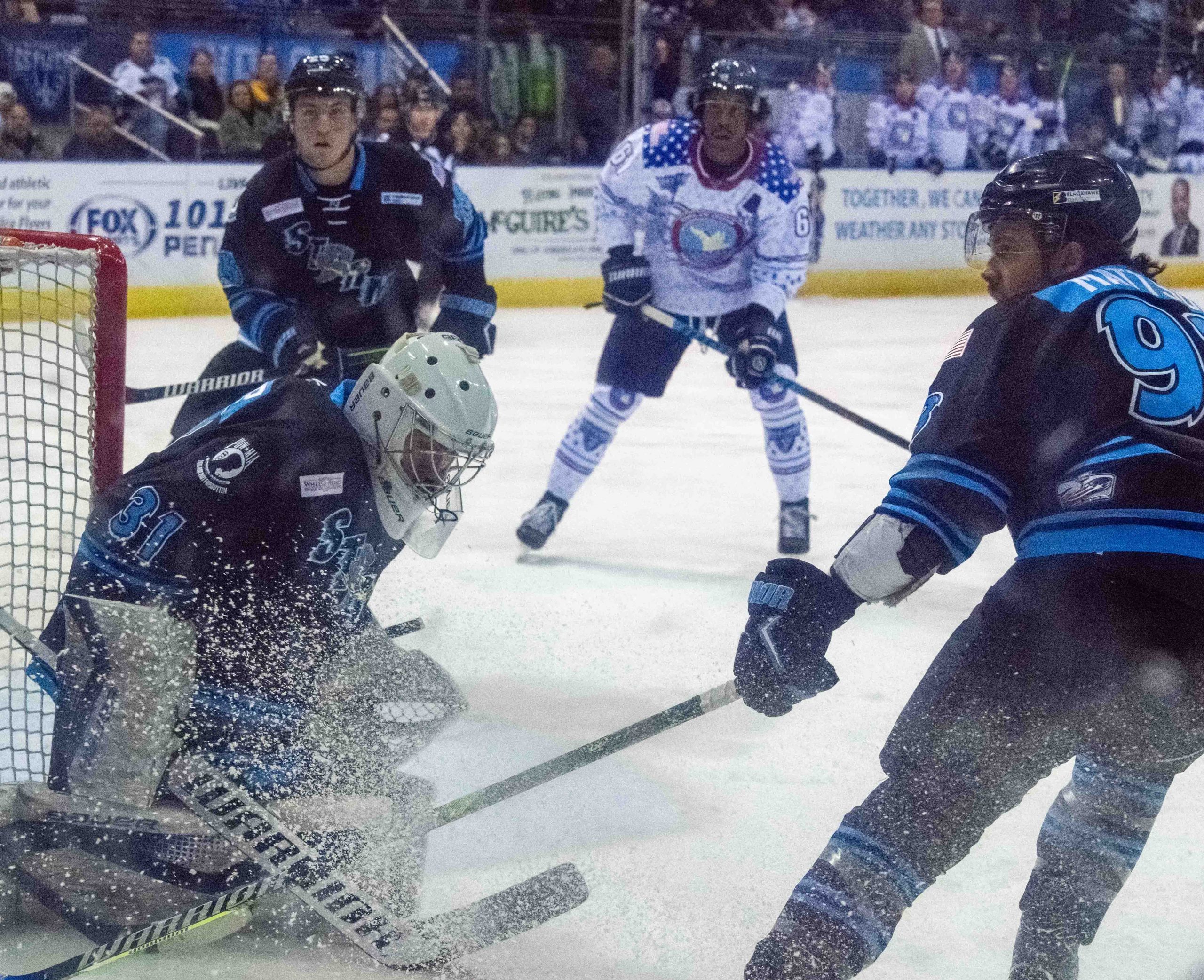 The Ice Flyers produced goals 10 minutes apart in the final period to energize the crowd. They gained an extra attacker with 1:30 remaining when pulling goaltender Steven Mundinger, but Quad City held on.