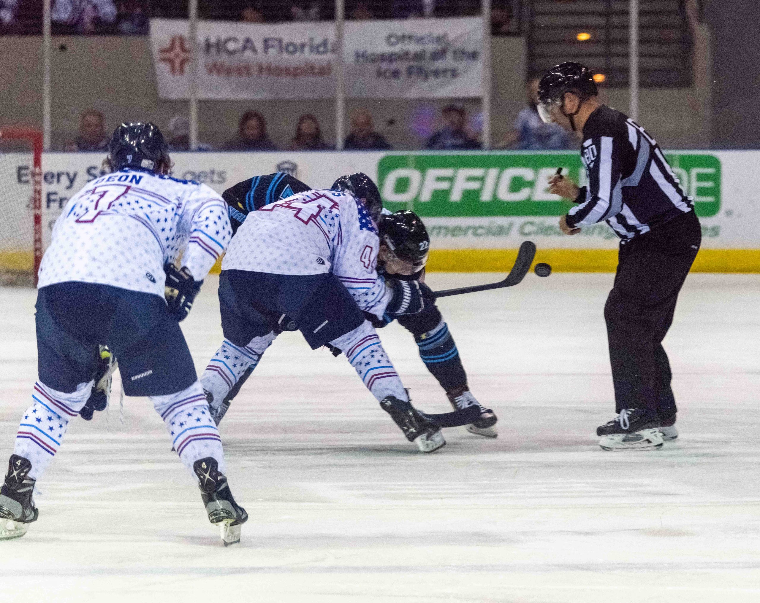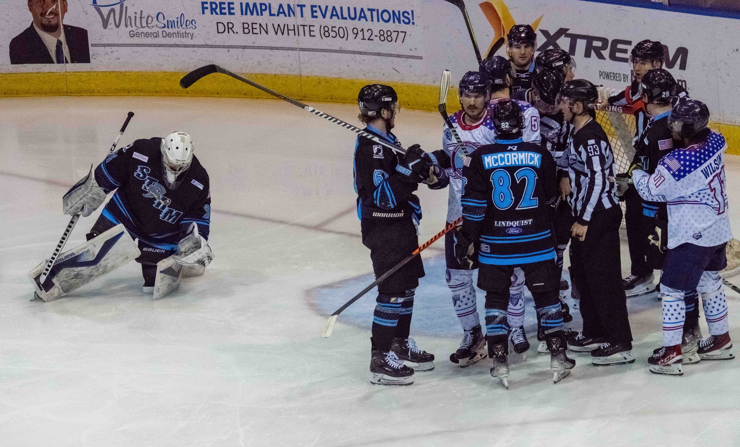 The Ice Flyers wore attractive red-white-blue jerseys with stars with the Naval Air Station Pensacola logo on the front. These jerseys were auctioned after the game with proceeds benefiting Covenant Care. The jerseys were also sold at the arena merchandise stands.